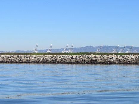 Southwestern shoreline of Alameda Point at Site 2 landfill. Rock/cement riprap seawall, with green embankment berm above. Looking north toward Port of Oakland.