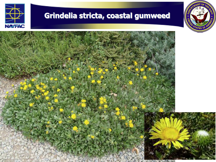 Previous Image Next Image Site 2 vegetation. Coastal gumweed. One of the native grasses to be hydroseeded on Site 2 in the fall of 2013.