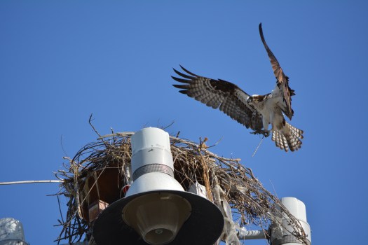 Previous Image Next Image Female osprey w/nesting Alameda Point Female osprey bringing nesting material to nest. Female identified by “necklace” of specks on breast.