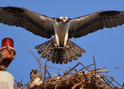 Male osprey bringing nesting material to light pole near maritime ships at Alameda Point with female looking on.
