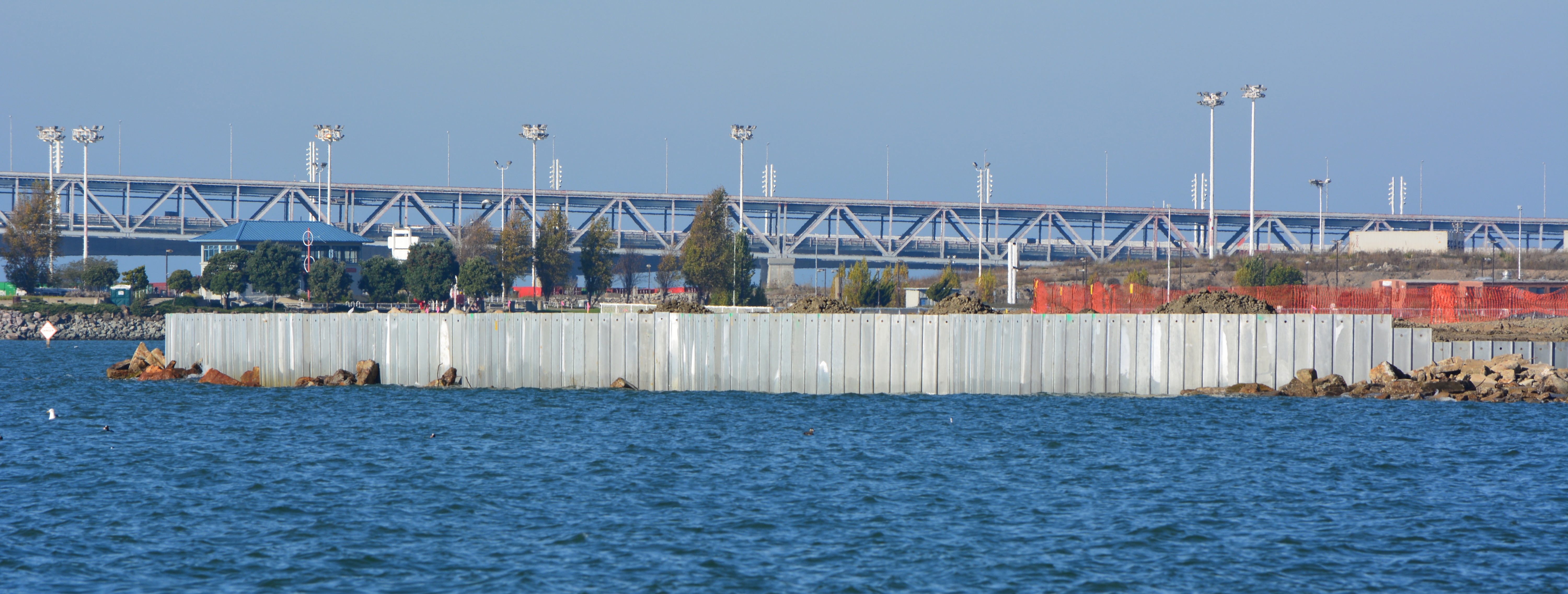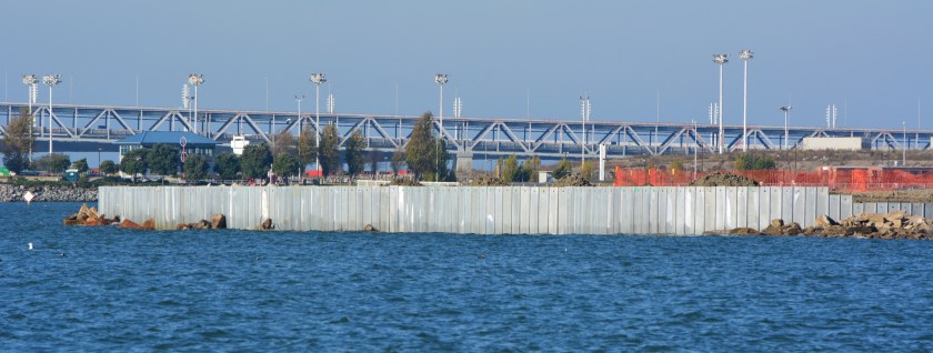 Completed Waste Isolation Barrier at Site 1 on northwest corner of Alameda Point. San Francisco Bay in foreground, Port of Oakland in background.