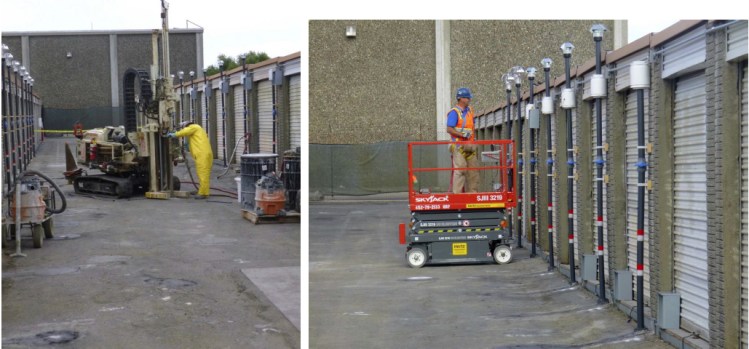 Site 13 at Alameda Point Storage with vent stacks installed by Navy to allow oxygen interchange with groundwater bacteria. Navy photo.