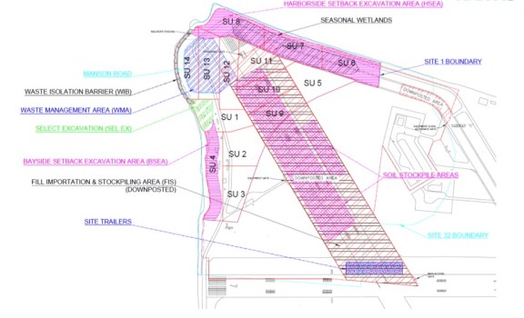 Previous Image Next Image Site 1 work design Design of Site 1 remediation plan. San Francisco Bay on left, Oakland Estuary on top. Navy graphic.