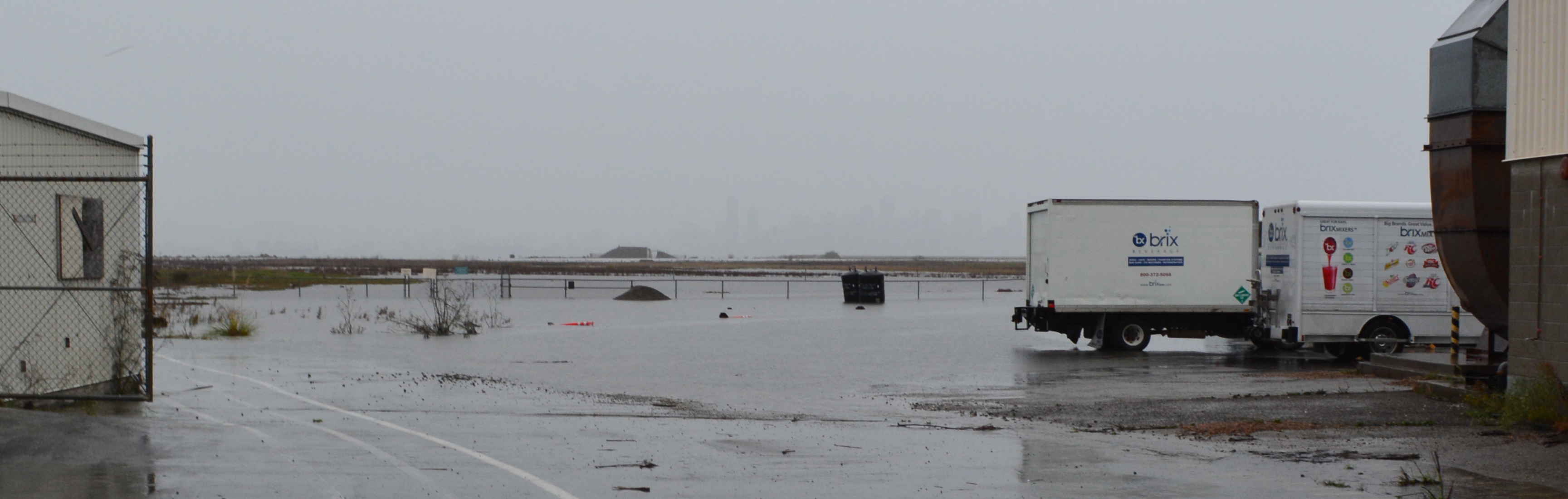 Flooding next to Building 25 (behind camera), looking toward Control Tower and Port of Oakland. VA federal property on the left.