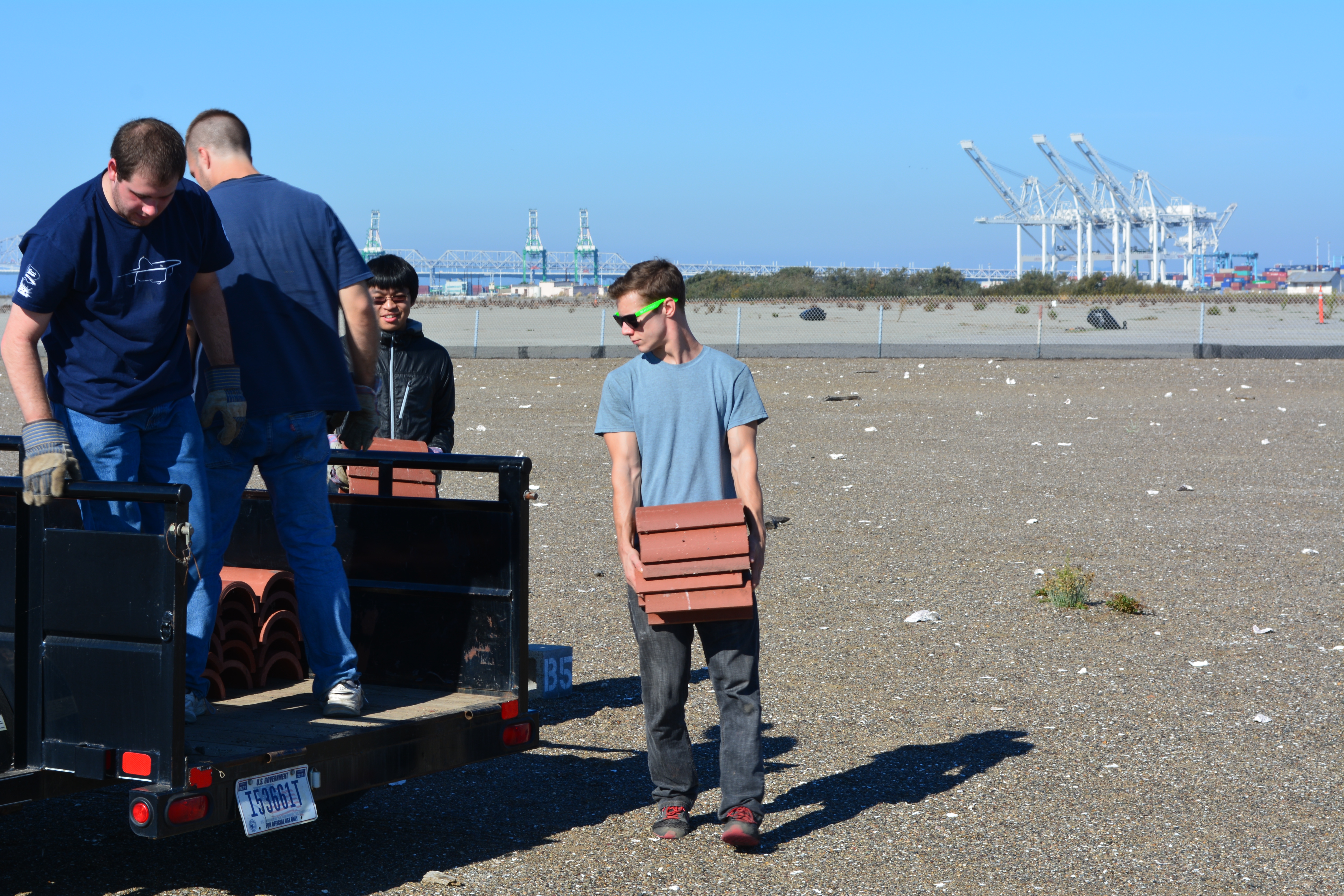 Tau Beta Pi students from UC Berkeley picking up drain tiles used as tern chick shelters. December 2014 work party.