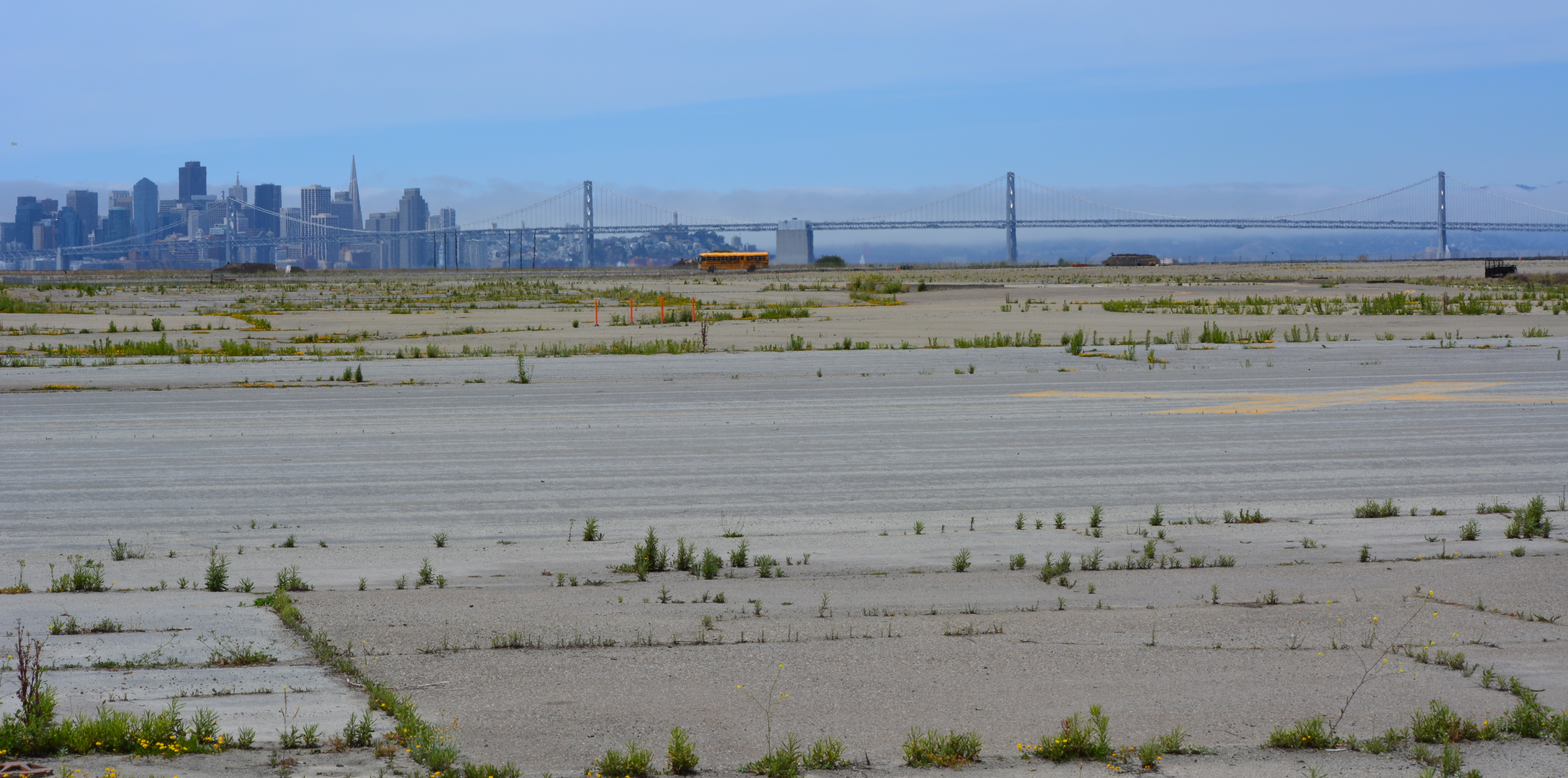 Least tern tour bus parked next to the nesting area on former Navy airfield.  San Francisco is in the background.