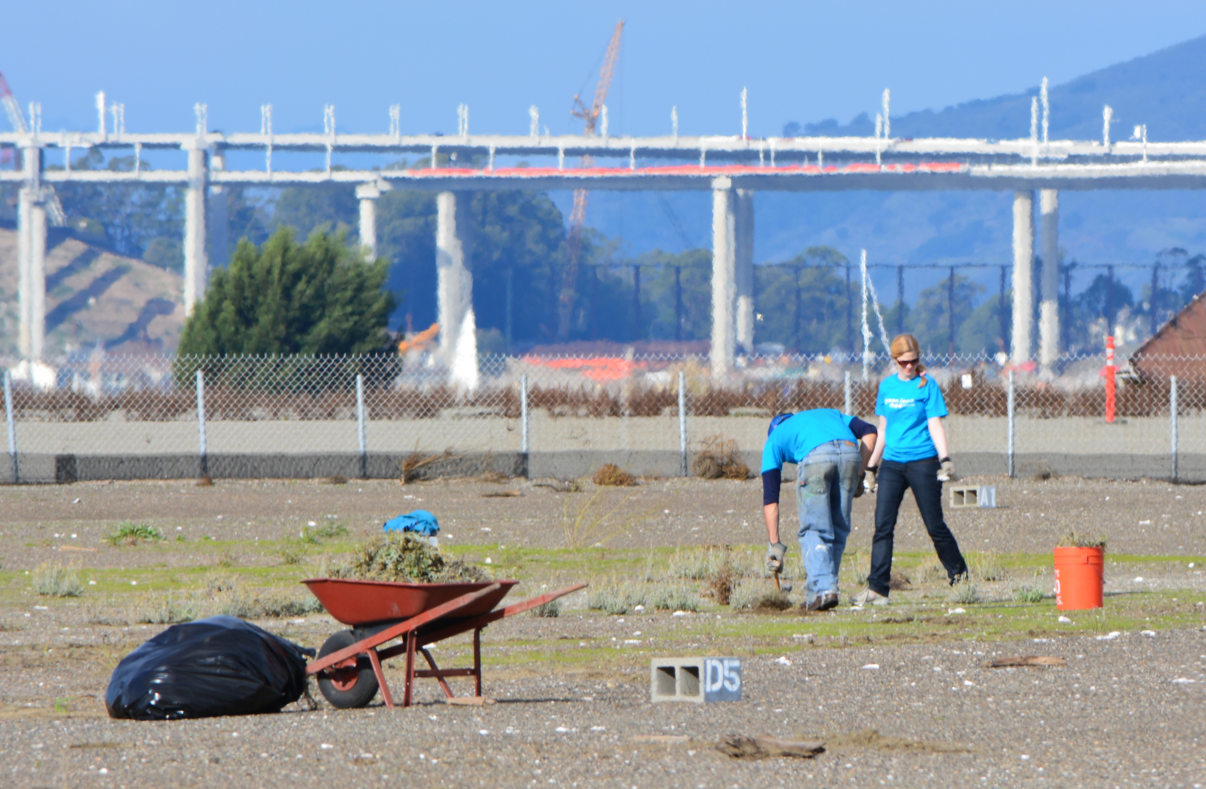 Volunteers removing weeds from the Alameda Point least tern nesting area during a December 2014 work party.