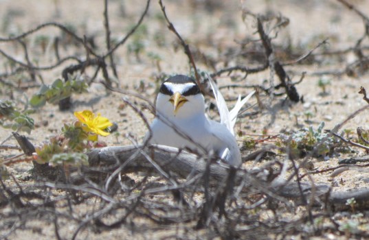 Least tern sitting on eggs at Huntington State Beach. The nest is simply a depression in the sand. The vegetation is not part of the nest.