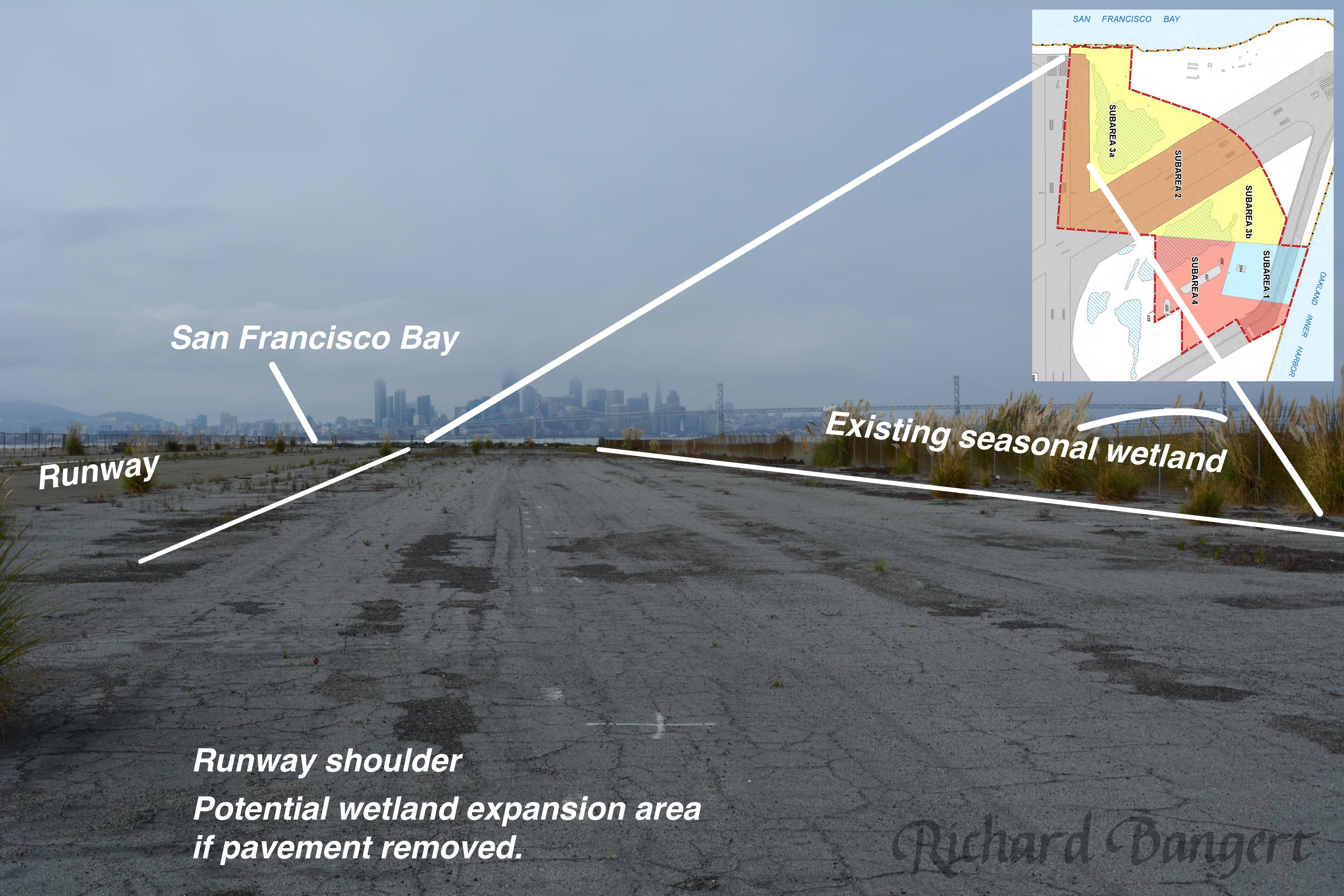 The site lies in the northwest portion of the old airfield along the Oakland Estuary and features open grassland, seasonal wetlands, runway, a large concrete bunker and two buildings. Input from the community and regulatory agencies on the cleanup plan will have a major impact on the design and use of the future park.