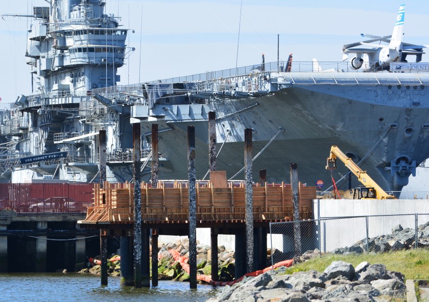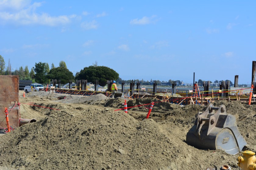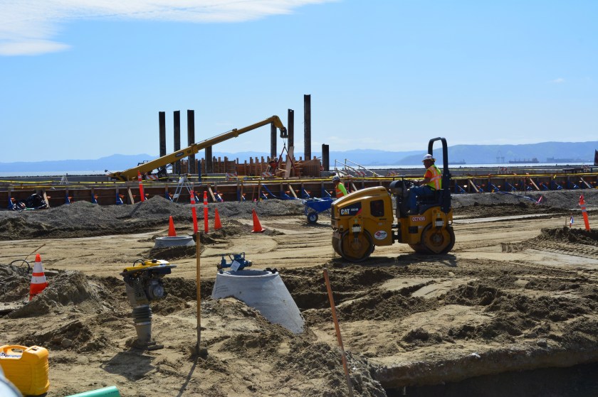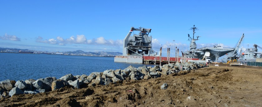 In other ferry news, construction of the ferry maintenance facility at Alameda Point near the USS Hornet Museum is moving ahead with visible progress on the foundation. New rip rap boulders have been brought in to spruce up the adjacent shoreline where WETA will be making public trail and observation area improvements. The Ron Cowan Central Bay Operations and Maintenance Facility will be completed in 2018 and berth up to 12 ferries. It will serve as an emergency operations command center in the event of a disaster.