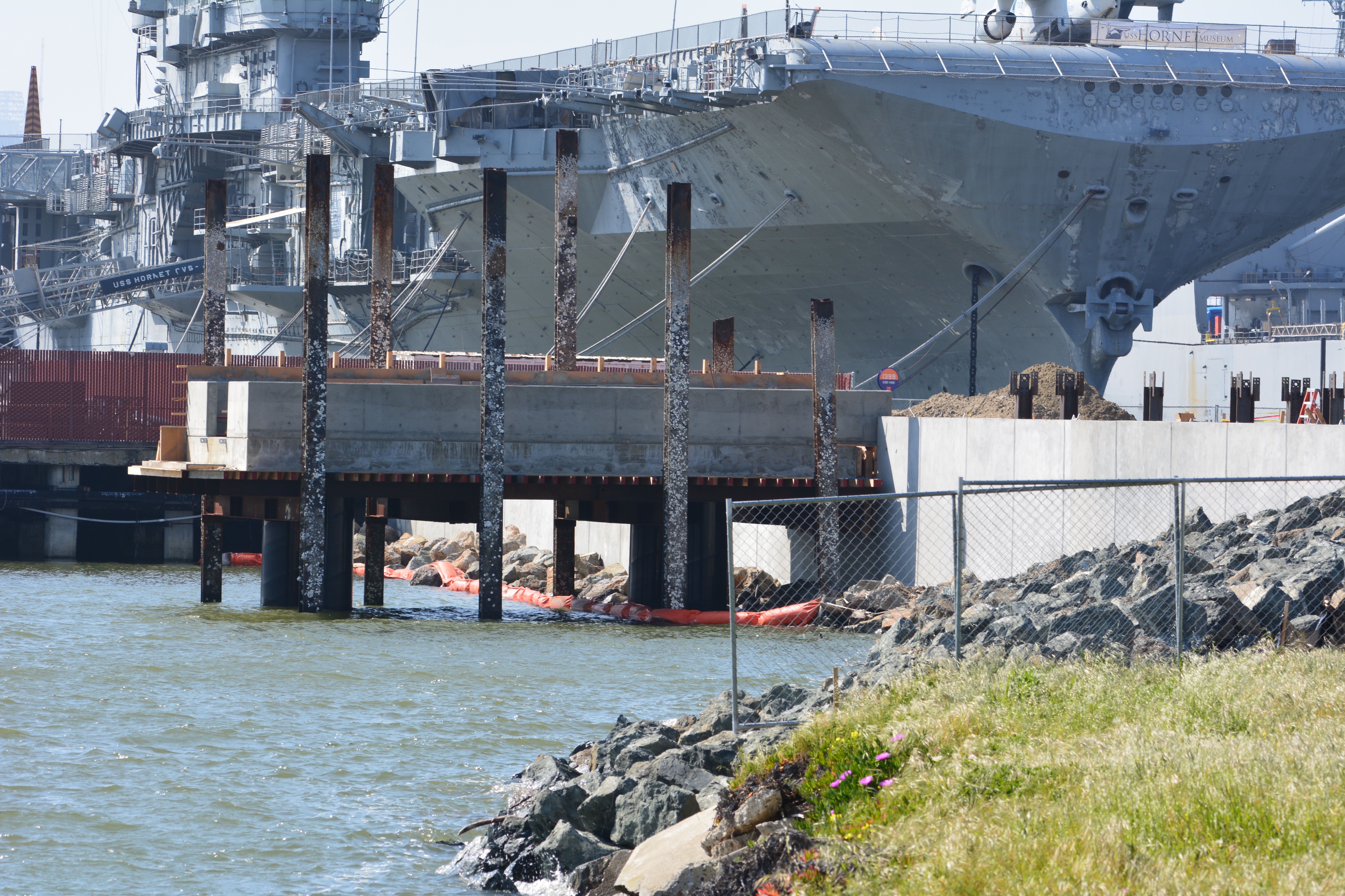 In other ferry news, construction of the ferry maintenance facility at Alameda Point near the USS Hornet Museum is moving ahead with visible progress on the foundation. New rip rap boulders have been brought in to spruce up the adjacent shoreline where WETA will be making public trail and observation area improvements. The Ron Cowan Central Bay Operations and Maintenance Facility will be completed in 2018 and berth up to 12 ferries. It will serve as an emergency operations command center in the event of a disaster.