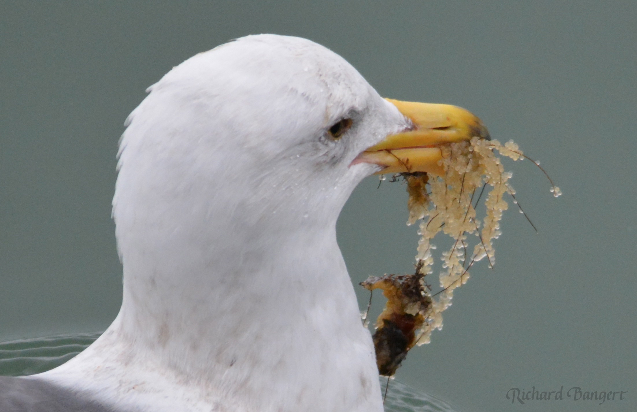 Gull holding vegetation laden with herring eggs near Pier 3 at Alameda Point on January 17, 2016.