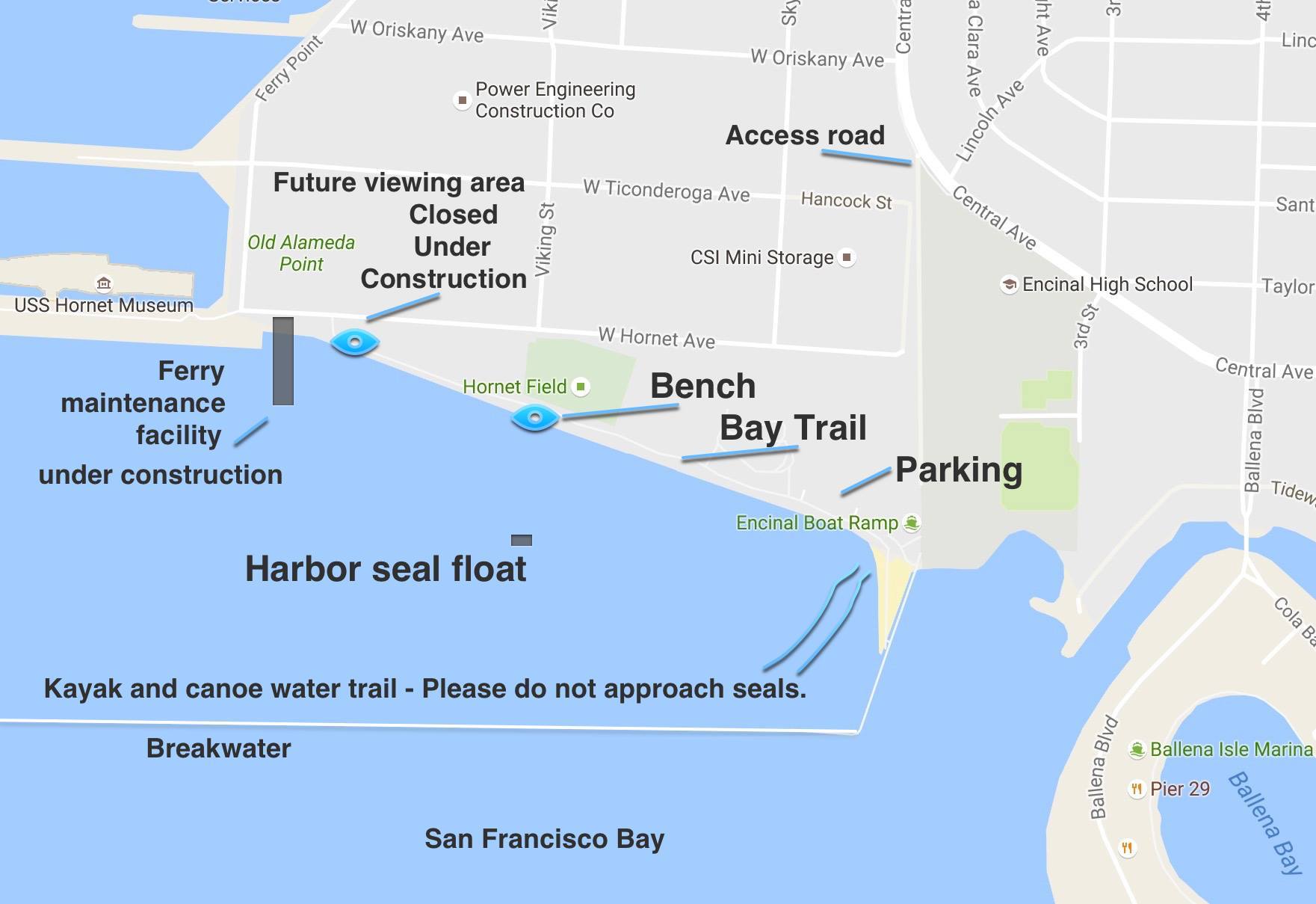 The public is encouraged to participate in monitoring.  More information and updates are on their Facebook page.  The seals can be observed from the Bay Trail, which is accessible via the Central Avenue entrance to the water next to Encinal High School.