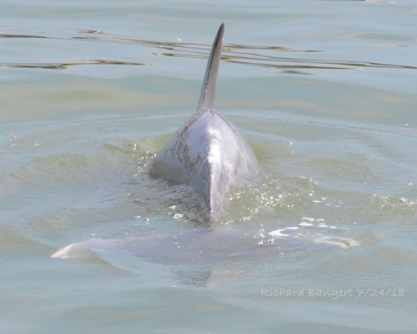 Bottlenose dolphins can live up to 50 years. They range in length from 8 to 11 feet and weigh between 300 and 500 lbs. Calves can remain with the mother for three or four years. Their conservation status is “vulnerable but not endangered.” Dolphins can be distinguished from porpoises by being larger and having taller more curved dorsal fins. A porpoise dorsal fin is the shape of a triangle.