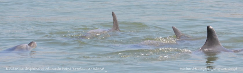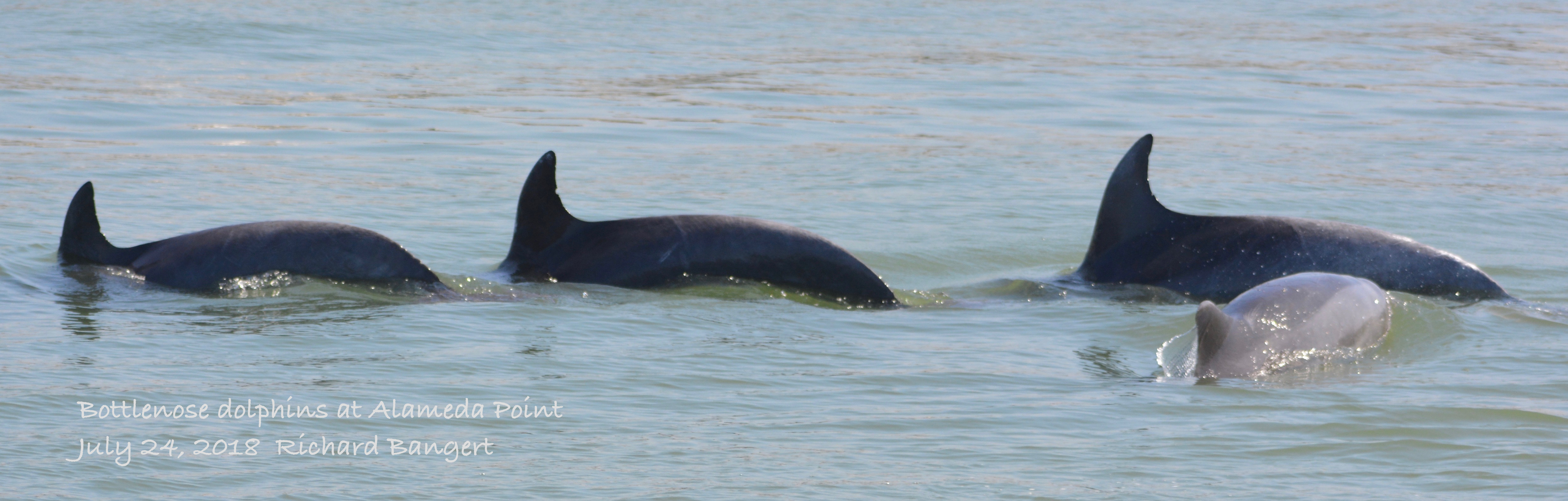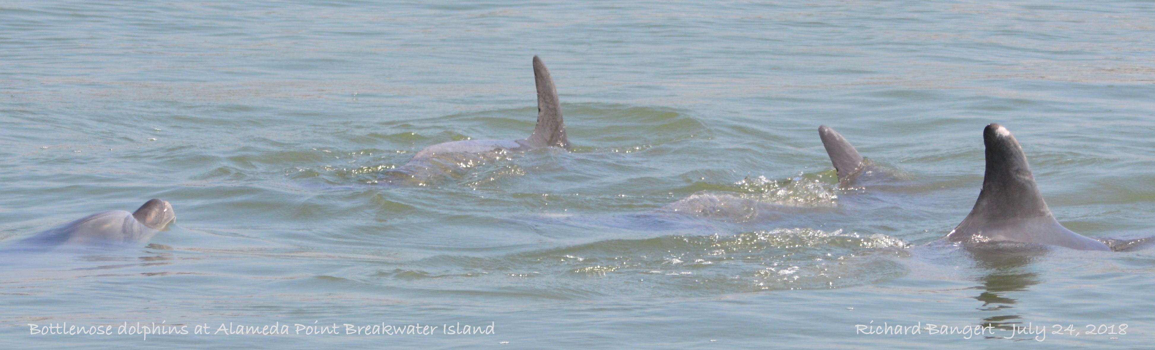 Bottlenose dolphins do not usually come to mind when thinking of wildlife at Alameda Point. In fact, only three have been observed there in recent years, and those sightings were from canoes and kayaks. But on July 24, two more dolphins were observed with two regulars meandering around next to Breakwater Island. The standalone rock wall, or breakwater, is visible from Pier 3 where the USS Hornet Museum is berthed.
