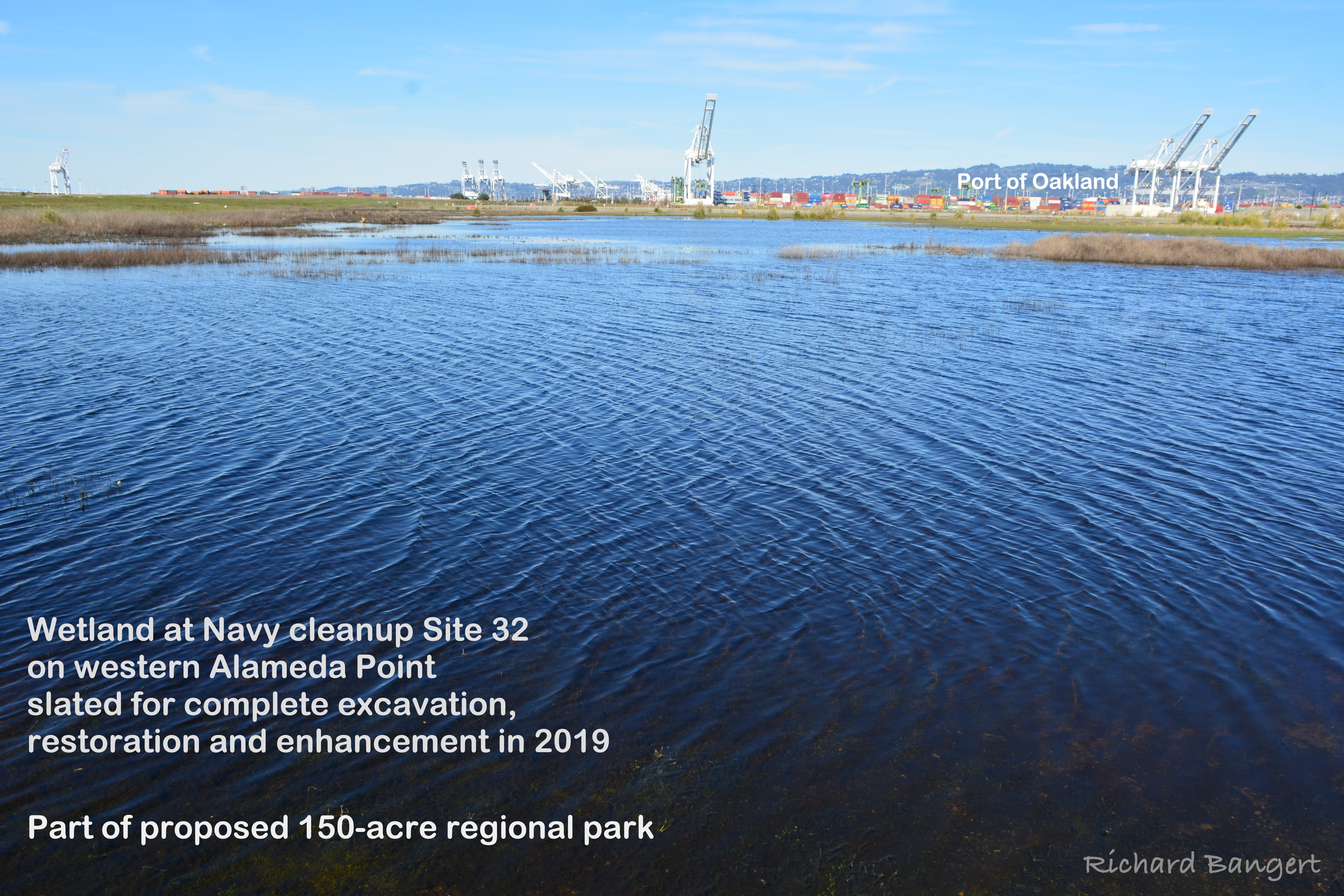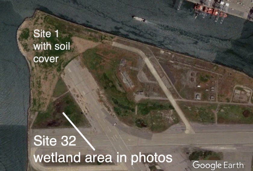 The adjacent Site 1 cleanup area at the very tip of Alameda Point is completed. The higher elevation of Site 1 is visible in the photos and is a result of the three-foot soil cover that was placed on the site.