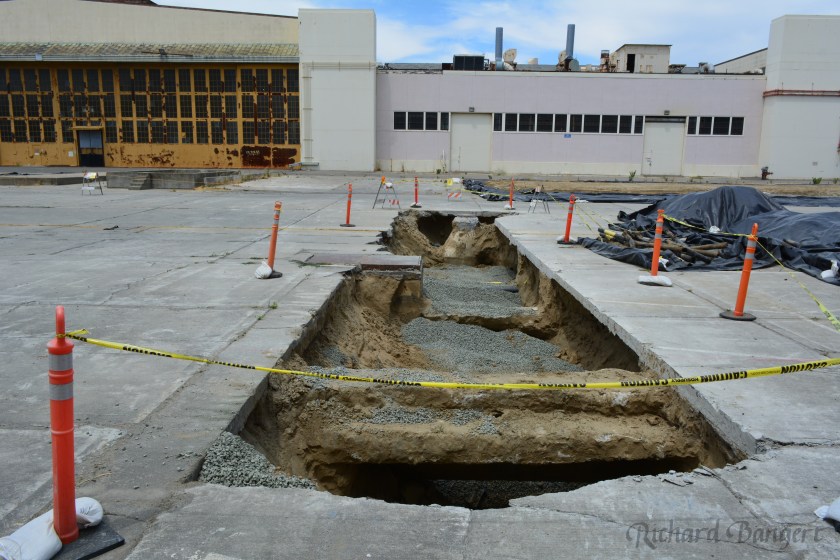 As part of a separate cleanup project, the end of West Tower Avenue at Monarch Street, also known as Spirits Alley, is currently closed to auto traffic. The street is closed in order for the Navy to remove four sections of an industrial waste line originating in Building 5 and another building across the street. The industrial waste line was installed in the 1970s after the federal Clean Water Act prohibited industrial discharges into public waterways. These sections, and two others on Lexington Street, could contain traces of radium paint disposed of from Building 5 and the hangar across the street. The city insisted that these sections be removed so that future infrastructure work was not complicated by expensive protocols for removing potentially radium-impacted pipes lying in the way of new utilities.