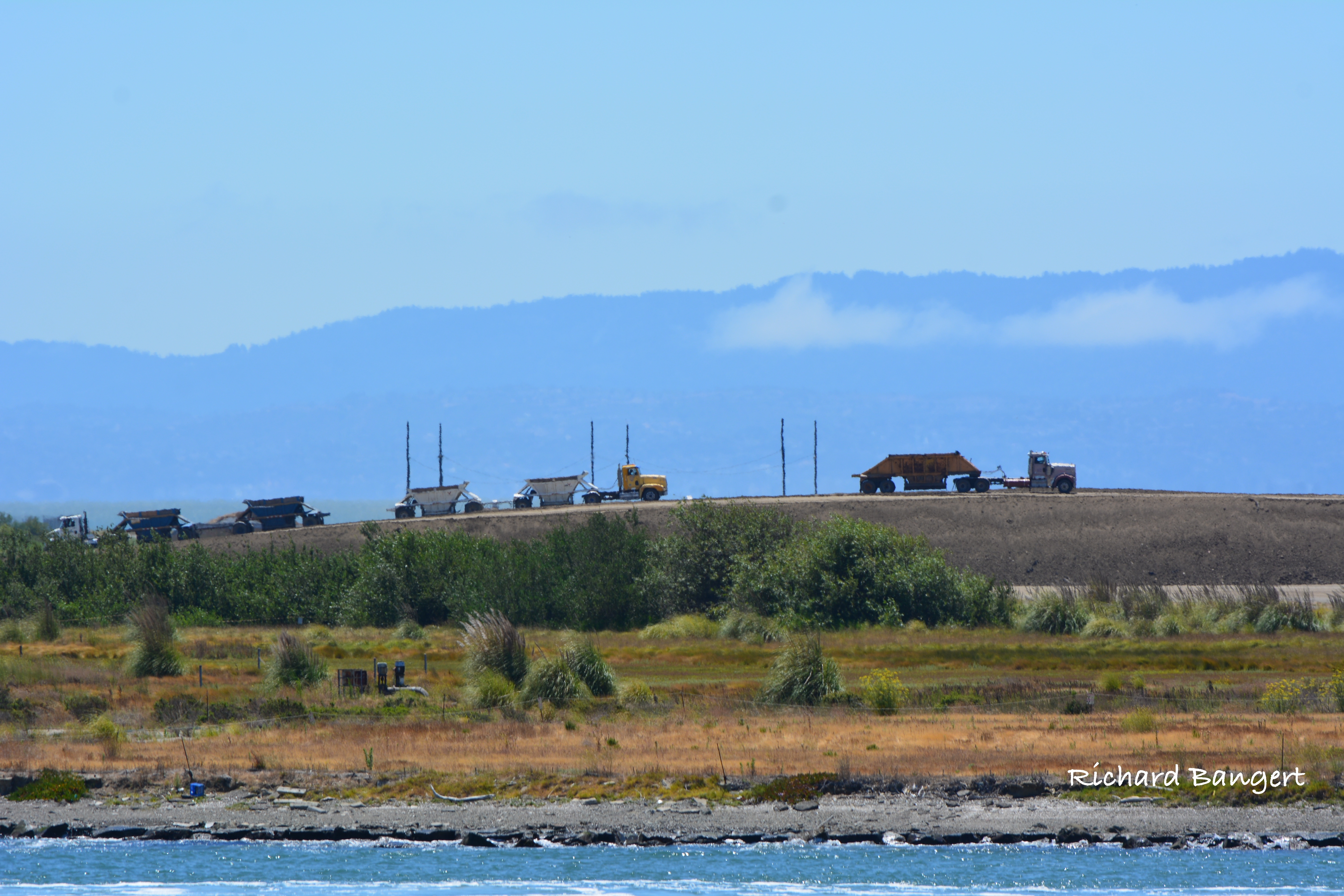 The large pile of soil in the photos is not part of the shoreline stabilization project. The soil in the photos will be bulldozed around the 60-acre site and down to the shoreline of the Estuary where new rock reinforcements will be put in place during the stabilization project. The shoreline stabilization project and its historical background will covered in an upcoming story.
