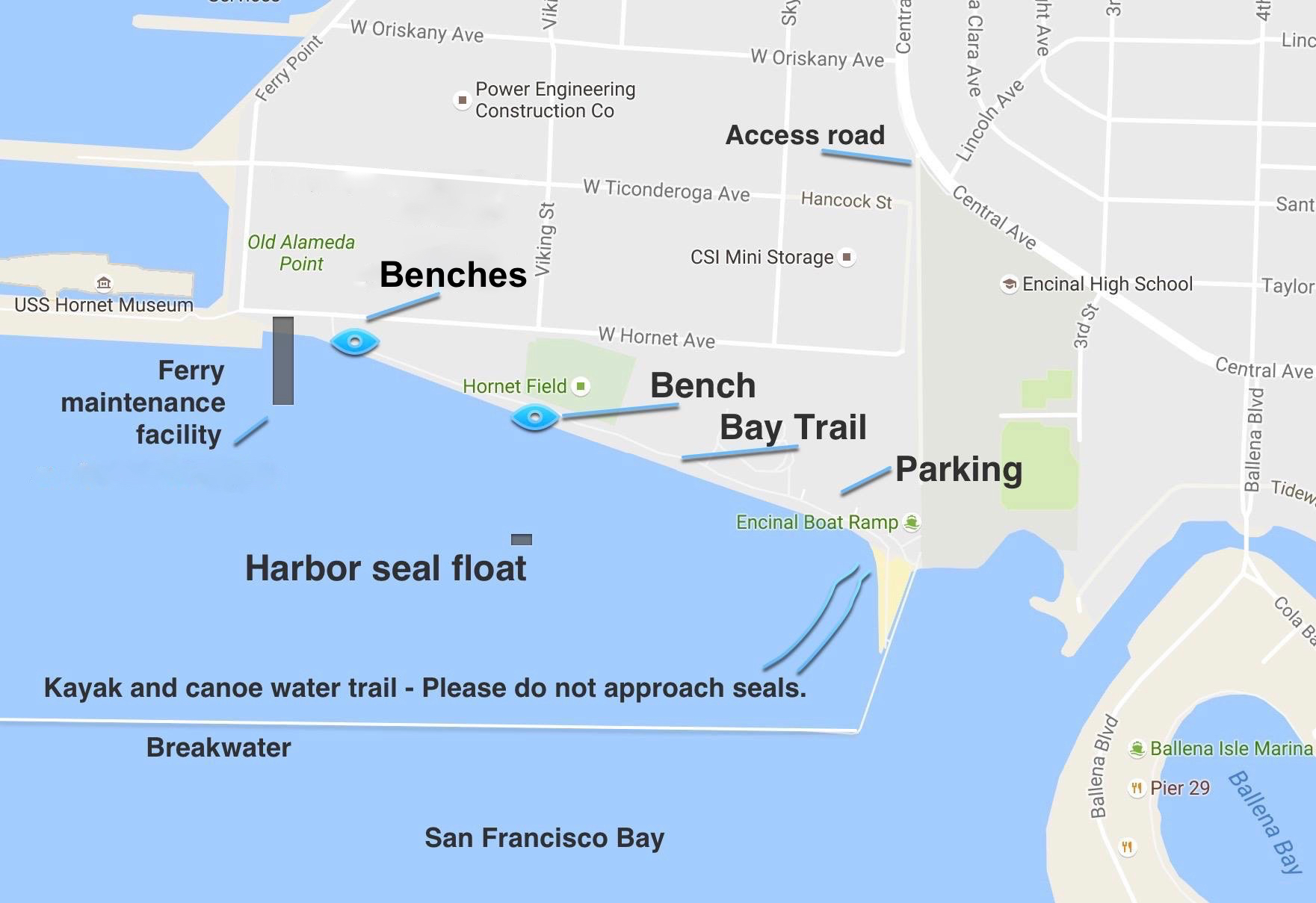 The harbor seals can easily be viewed from the Bay Trail, which runs between the Encinal Boat Ramp and the ferry facility.  After 1 PM is a good bet for seeing the most seals in December and January.