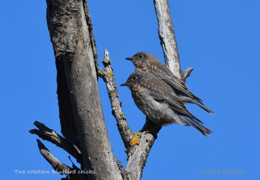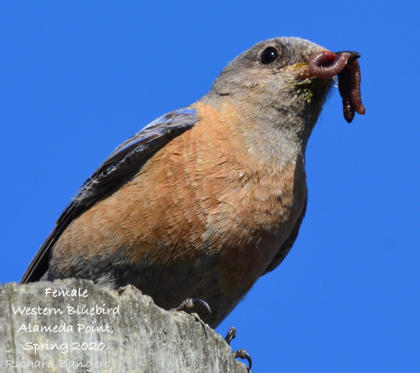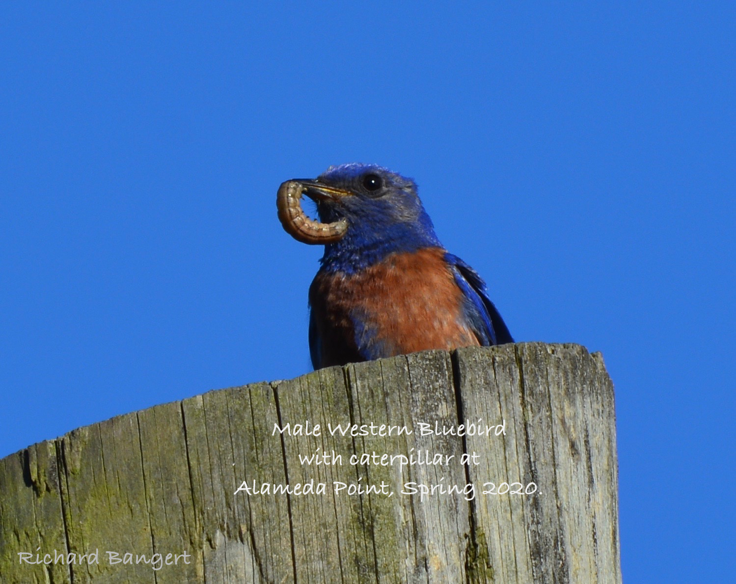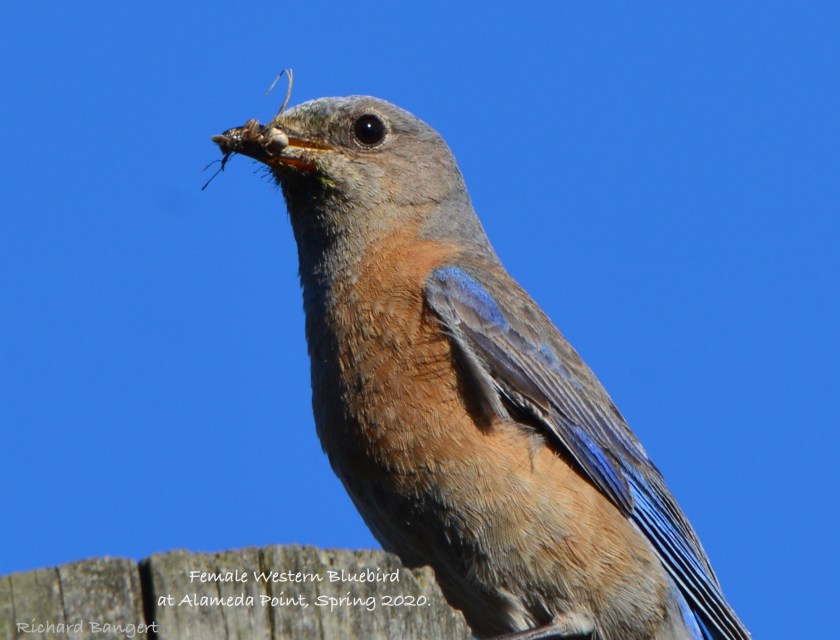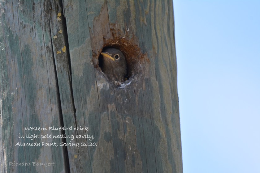This was the only clue in early May 2020 that a pair of Western Bluebirds had a nest at the old campground at Alameda Point. The chicks were silent and unseen for weeks until they began peering out of the hole a few days before flying away.