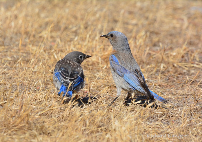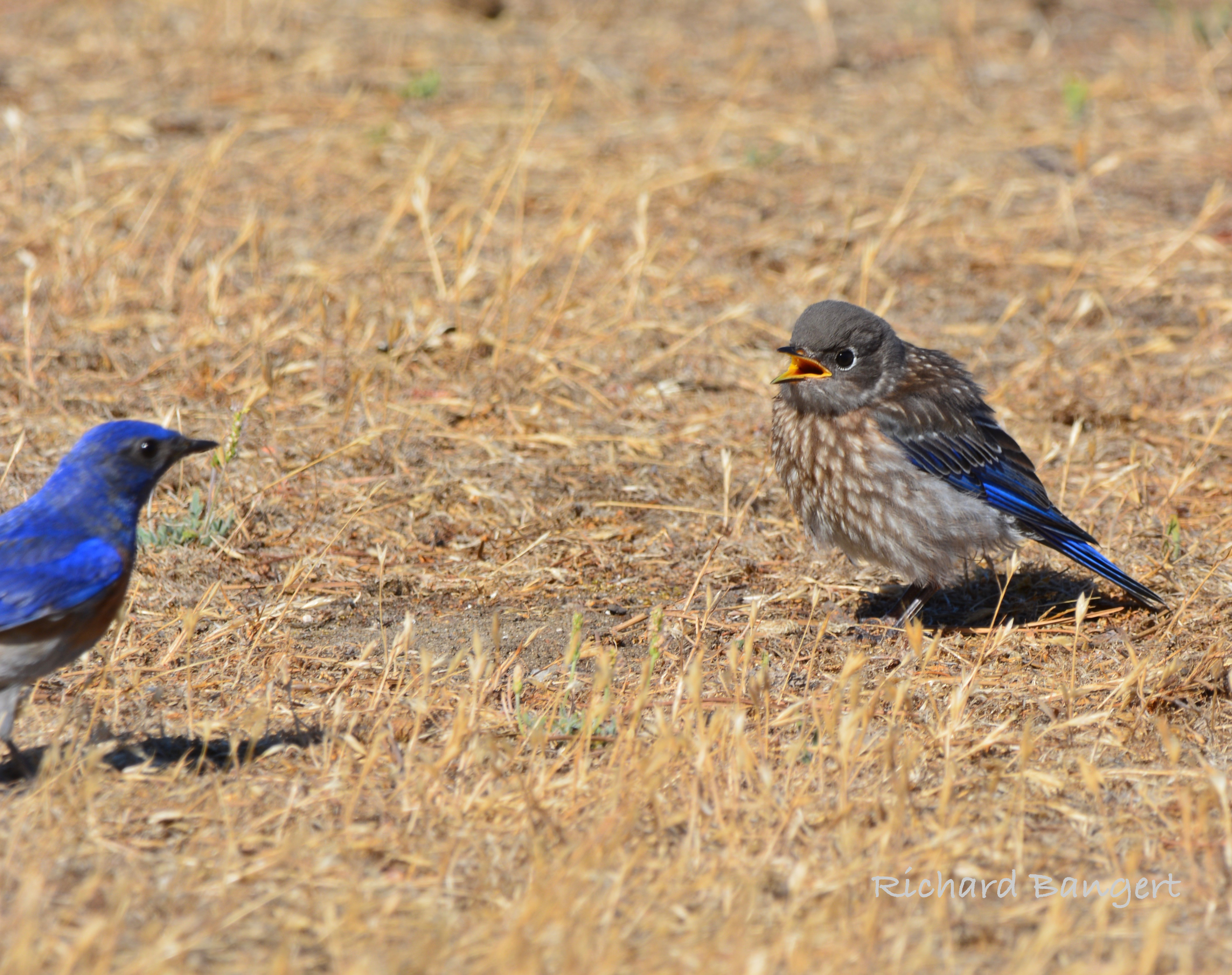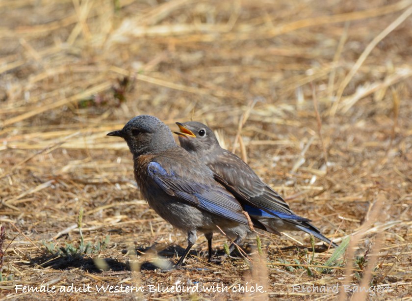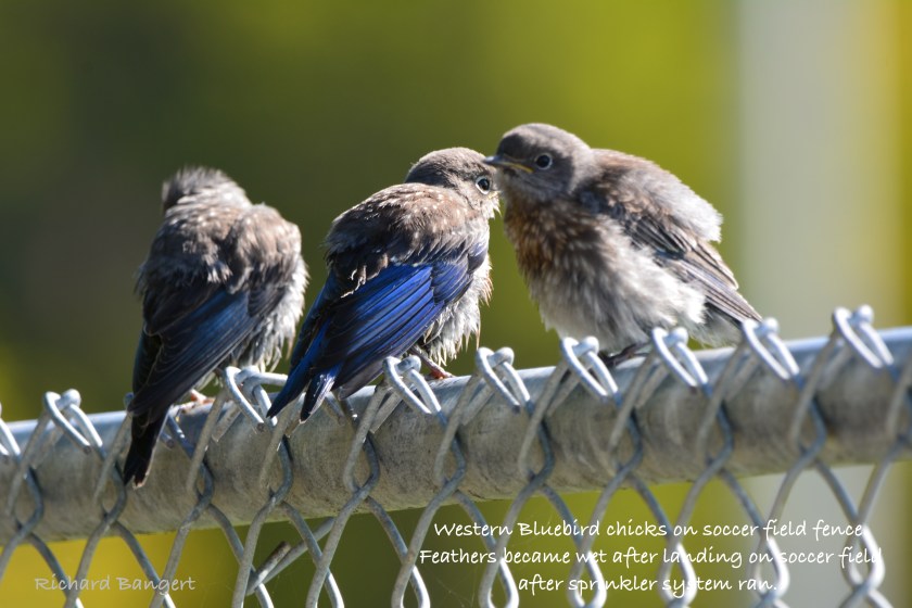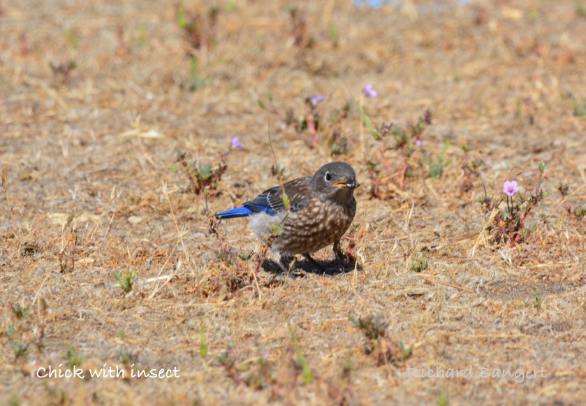 After an absence of two days at the end of May, I returned to find no sign of the adult bluebirds who could normally be spotted within minutes on one of their regular perches. The family of bluebirds – three chicks and two adults – were soon spotted in a nearby grassy field close to the ferry maintenance facility. The adults were teaching their youngsters to forage for food, even as the young fledglings continued to beg for food.