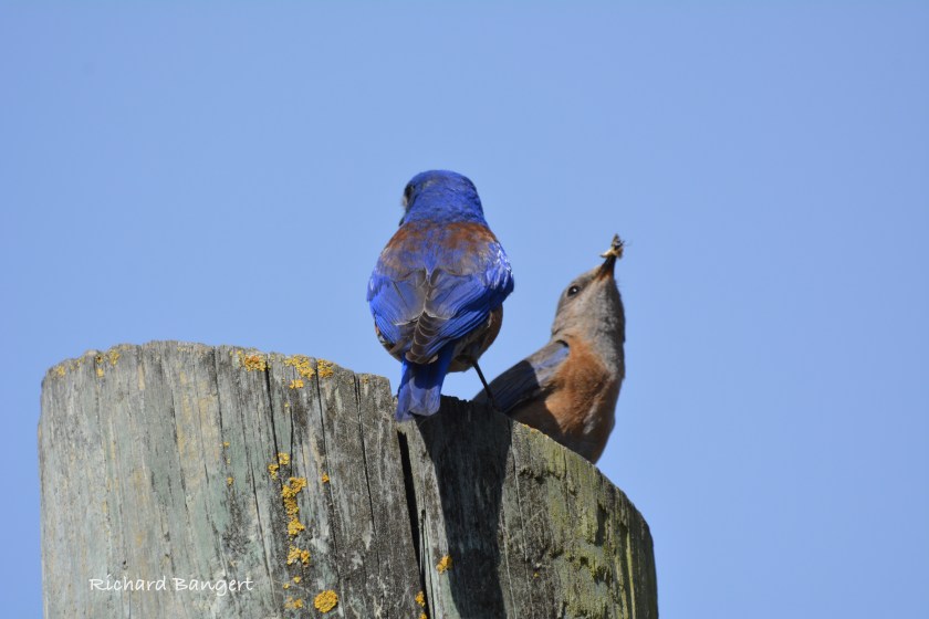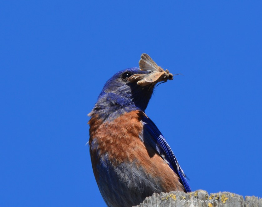 The brightly colored male and its grayer colored mate were spotted briefly landing on top of an old light pole, as if to show off their insect catch. More likely it was a precautionary stop to ensure that no predators were lurking nearby before springing into air and entering the nest cavity in the pole just below the top.