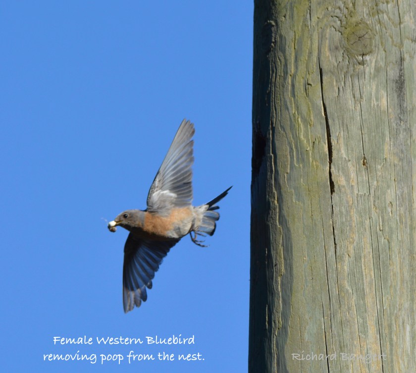 At least once a day, one of the adults would exit the nest hole with a clump of whitish colored poop, but with rare exception they never dropped the poop near the light pole. They always carried it a good 30 feet away before dropping it. This appears to be a calculated behavior to avoid attracting the attention of a roving predator who could scale the pole and attack the nest.