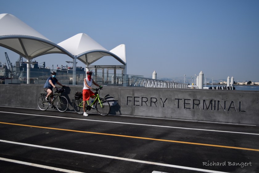 The fence blocking Ferry Point Road near the Seaplane Lagoon terminal has been opened enough to allow bike riders and walkers to pass through.  It is now possible to ride or walk from the Encinal Boat Ramp and Breakwater Beach past the ships and ferry terminal and continue past the Air Museum all the way to West Tower Avenue.  There is also the option of turning east at the partially completed waterfront park that is part of the Site A development and heading down West Atlantic Avenue.