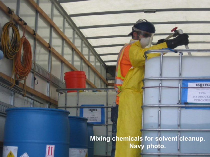 The reason the faster chemical oxidation process was ruled out for that site is because there are numerous utility pipes for electrical, gas, water, and sewer that crisscross the cleanup site. Injected cleanup chemicals would end up being diverted when they hit the various pipes and frustrate the even distribution of the cleanup chemicals. Bacteria, on the other hand, is already there and can spread on its own after injecting food sources like lactose and veggie oil, which the Navy has done.