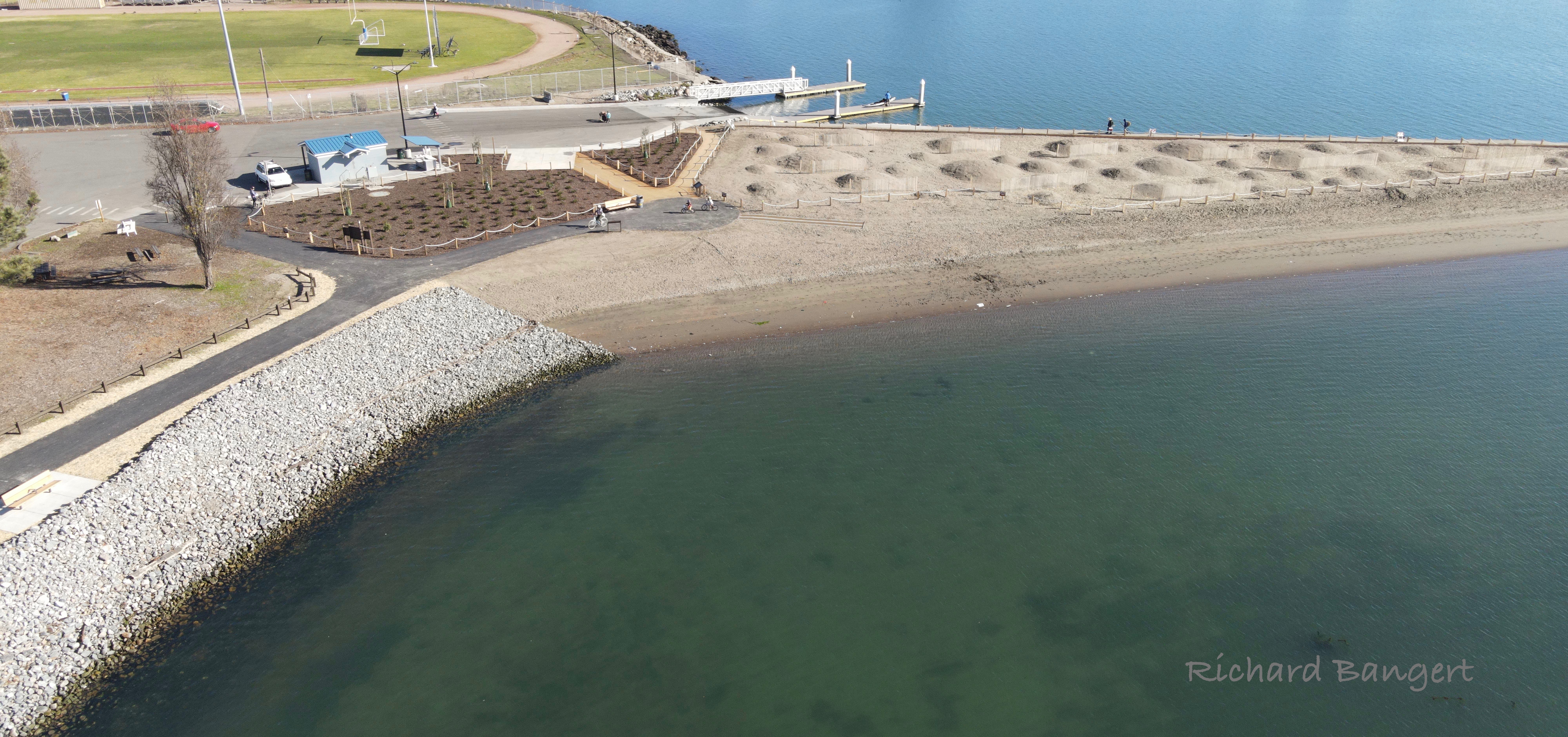 The beach itself was bolstered with more sand to provide resilience to sea level rise. A rusted-out barge hull that once served to stabilize the shoreline when the jetty system was built in the 1940s was removed, and a new rock shoreline was constructed to slope down from the Bay Trail.
