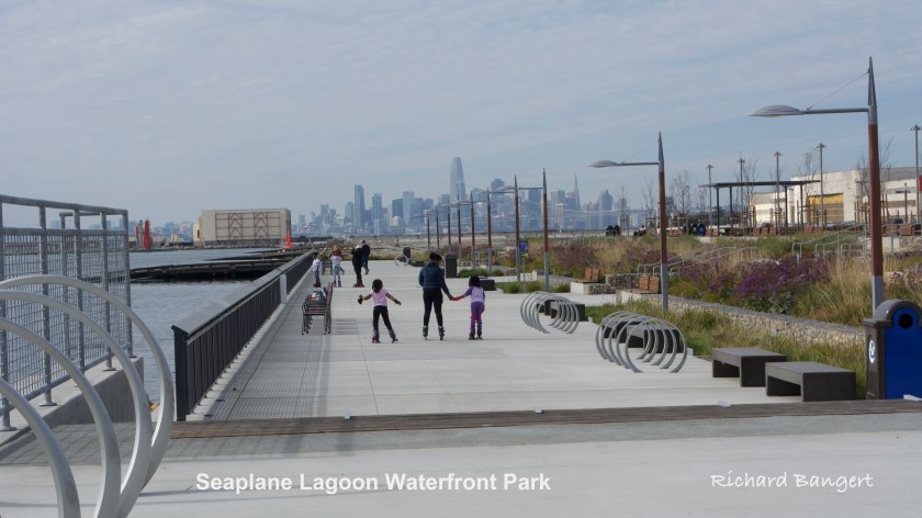 The first phase of the waterfront park on the north side of the Seaplane Lagoon at Alameda Point opened for public use on Monday, January 31, 2022. Moments after the construction fencing came down, people began enjoying the new park. The park was built by the developer of the adjacent mixed-use area, Alameda Point Partners. Future phases will be built by other developers.