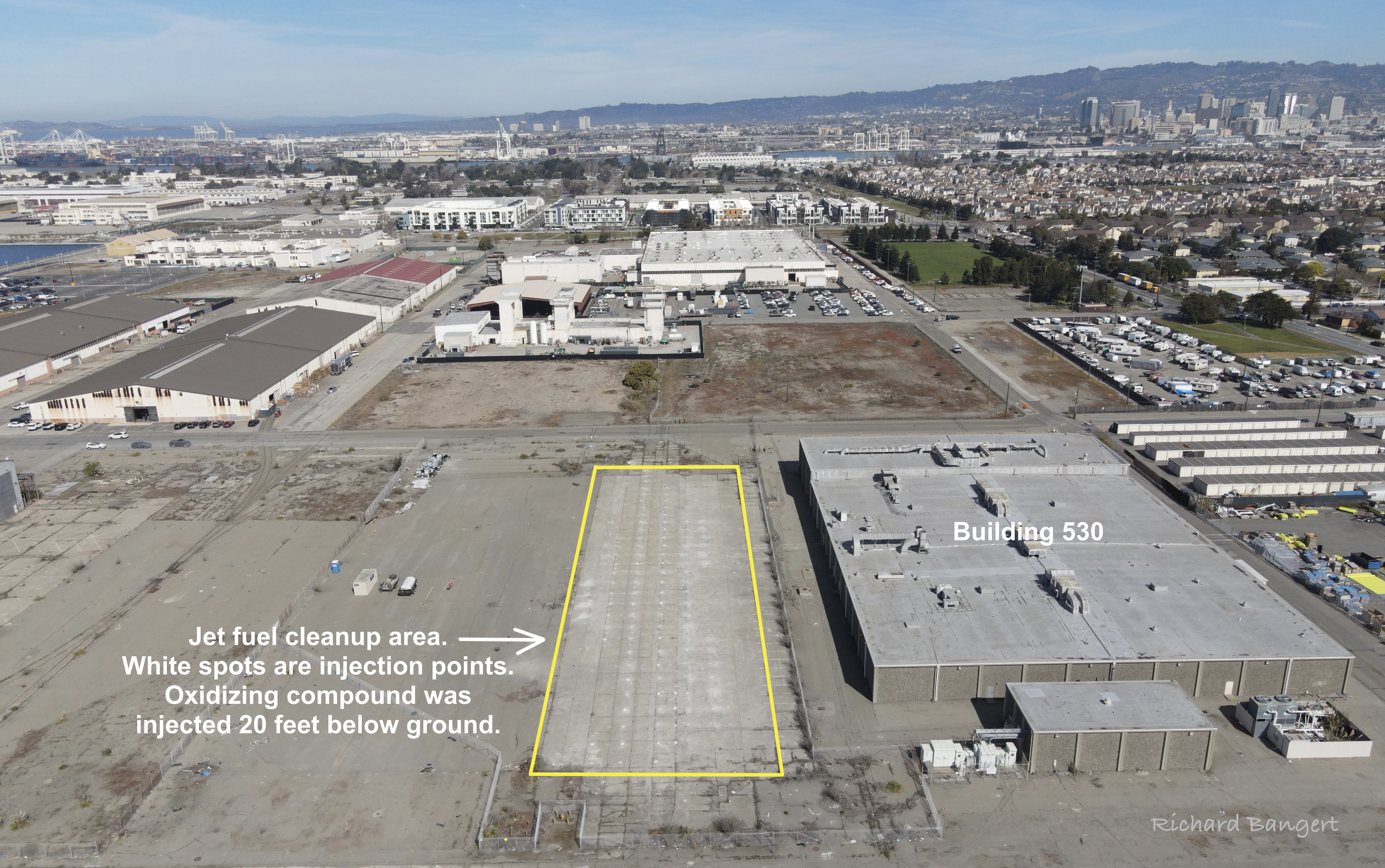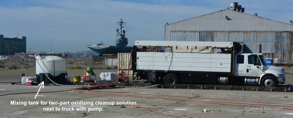 Draining jet fuel from Navy planes, known as defueling, was a routine step before doing maintenance work on the planes.  This defueling process at Alameda Point inadvertently contaminated groundwater at one location across the street from the Pottery Barn Outlet on West Oriskany Avenue.  During February, the Navy’s cleanup contractor conducted a form of industrial-scale in-ground chemotherapy known as oxidation.