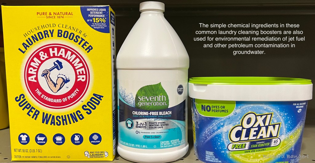 Various formulas for chemical oxidation of petroleum products in groundwater have been in use for decades.  Coincidentally, one of those formulas relied upon another chemical found in household laundry cleaning products – hydrogen peroxide, which is the main ingredient in chlorine-free bleach.