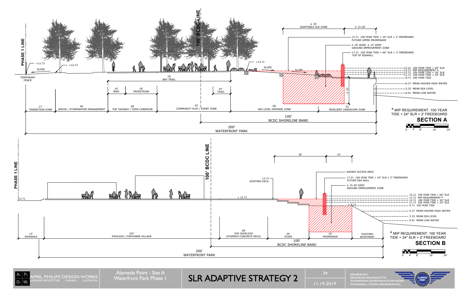 The upper areas of the waterfront park are designed to be resilient to flooding at 2100, assuming 3.4 feet of sea level rise (under the “low” risk aversion scenario in the 2018 State of California Sea Level Rise Guidance) and a 100-year storm event.