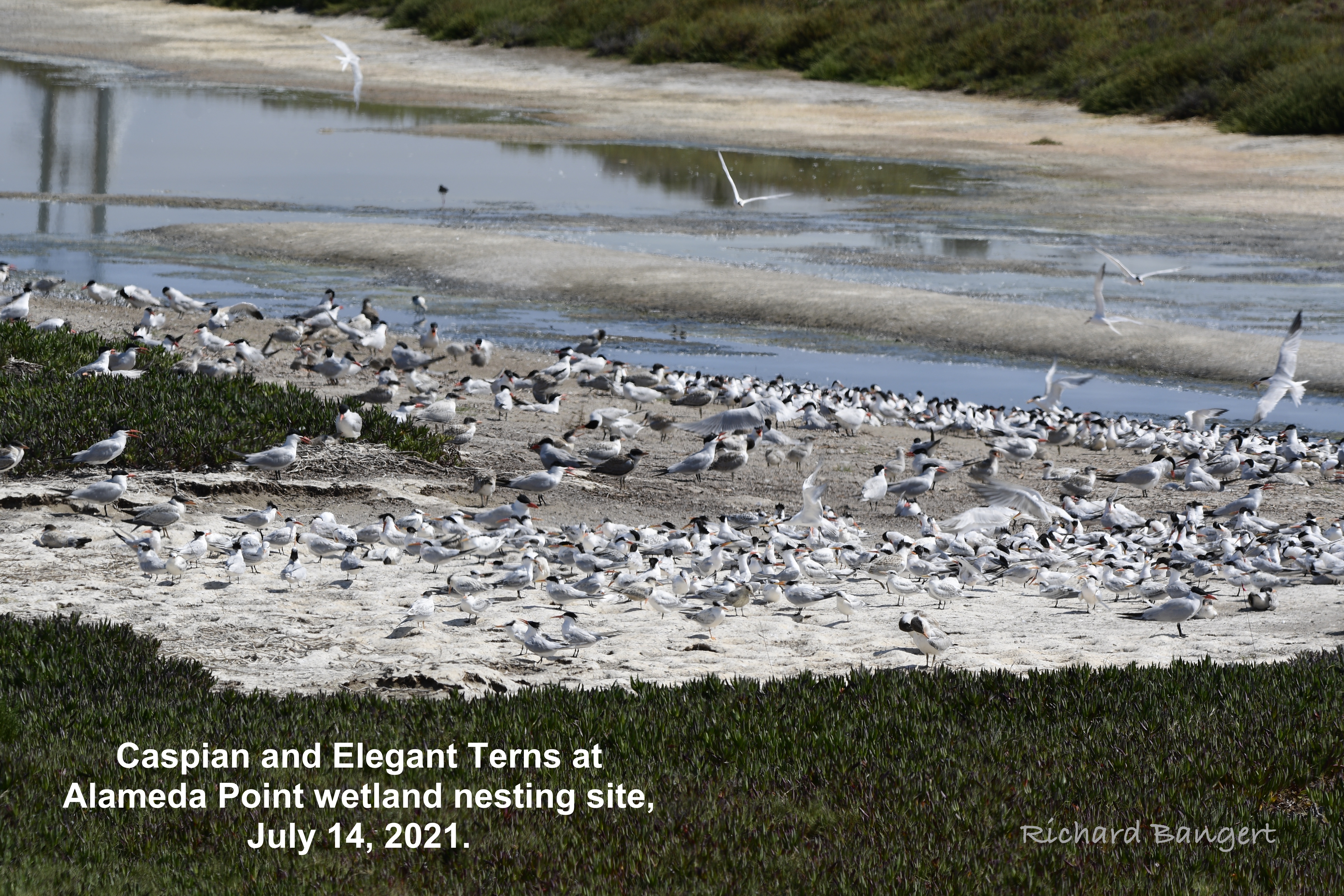 Elegant Terns, whose historic breeding grounds are also along the southern California coast and in Mexico, have started nesting at Alameda Point on a beach in wetland not far from where the Least Terns nest. When the Elegant Terns were first seen nesting at Alameda Point in 2019, it was the first documented instance of this species nesting this far north.