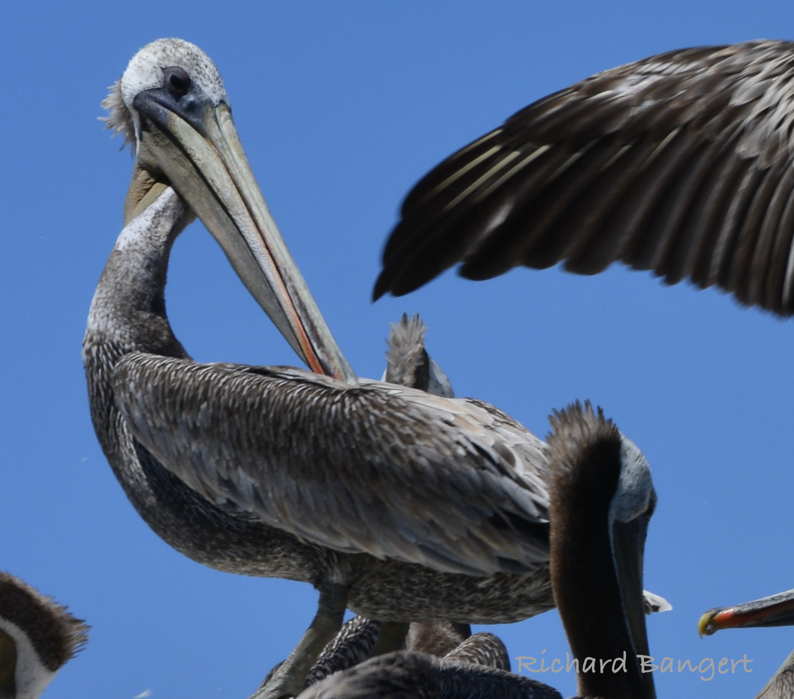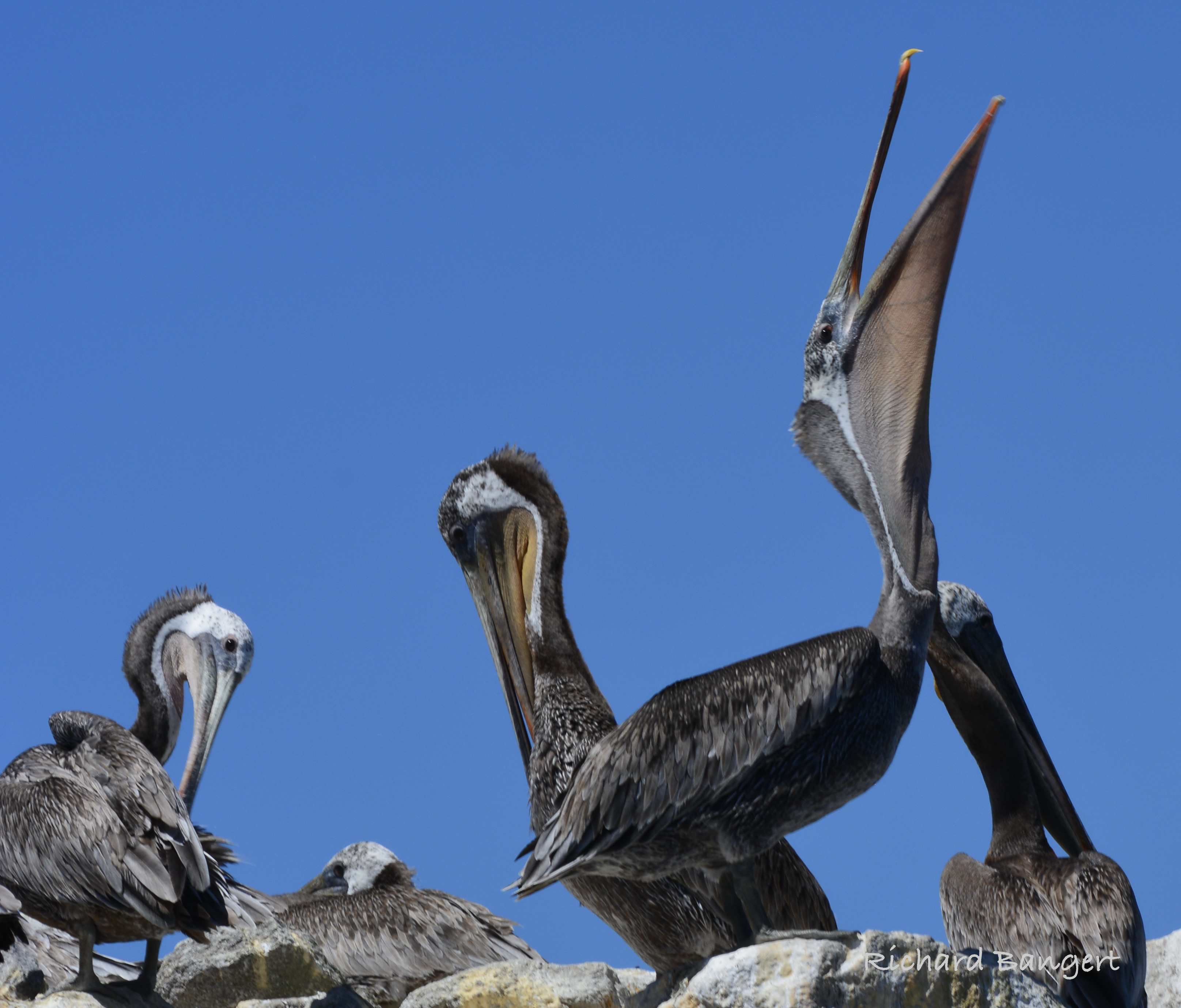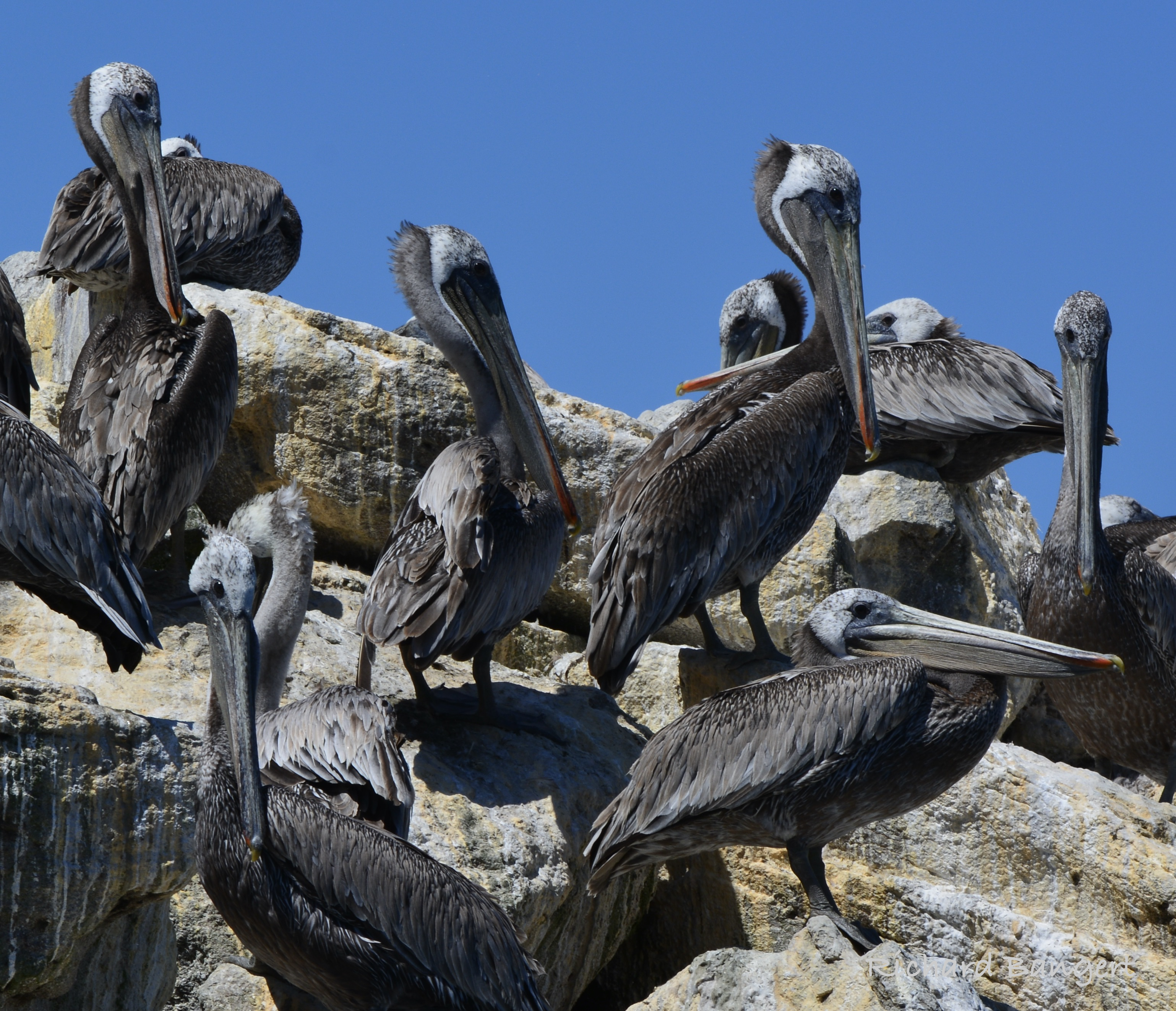 Every summer, thousands of California Brown Pelicans migrate north to the San Francisco Bay area from breeding sites on the Channel Islands and Mexico.  As many as 8,000 have been counted on their favorite resting site in the Bay on the isolated breakwater barrier at Alameda Point, known as Breakwater Island or the outer rock wall.