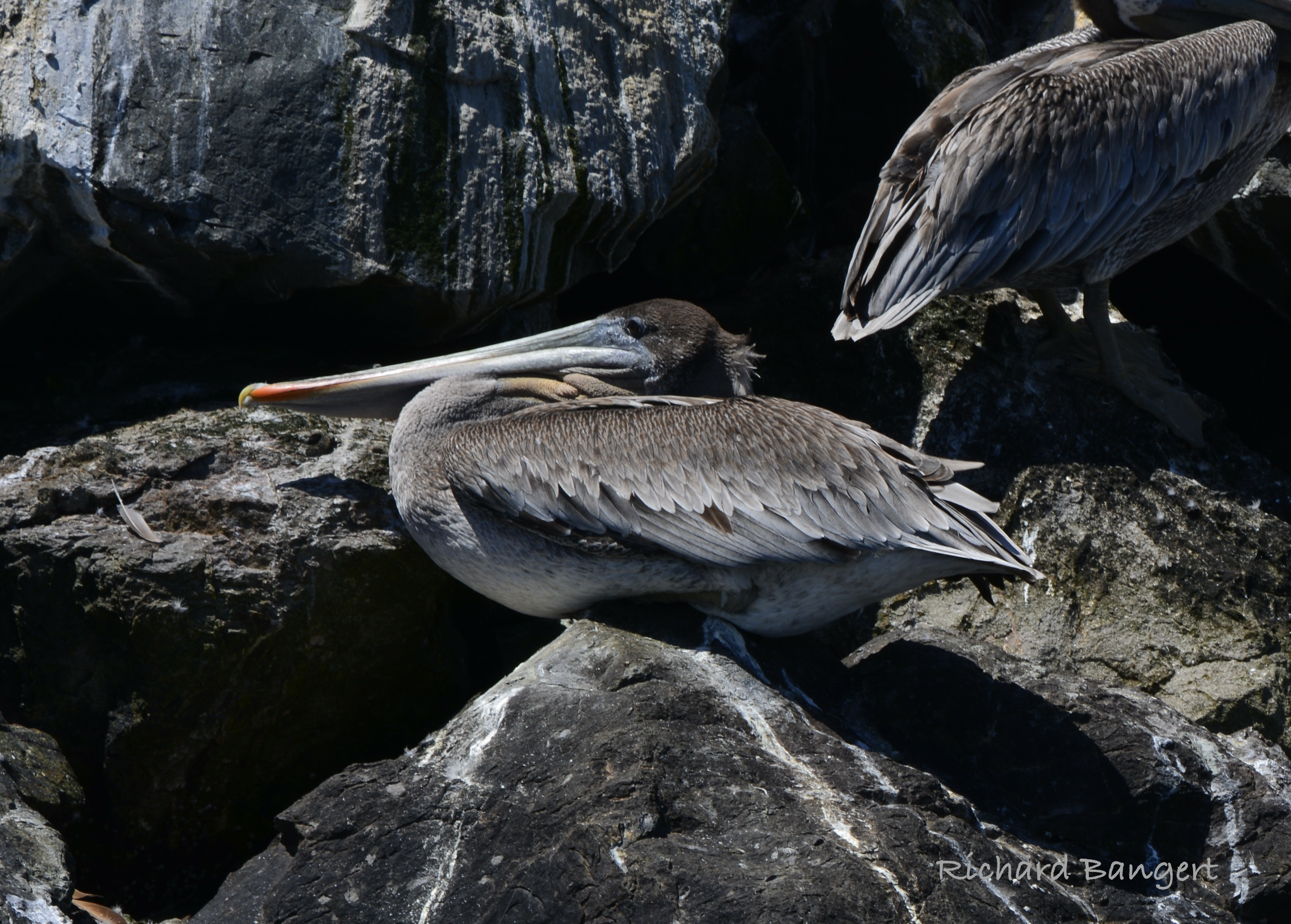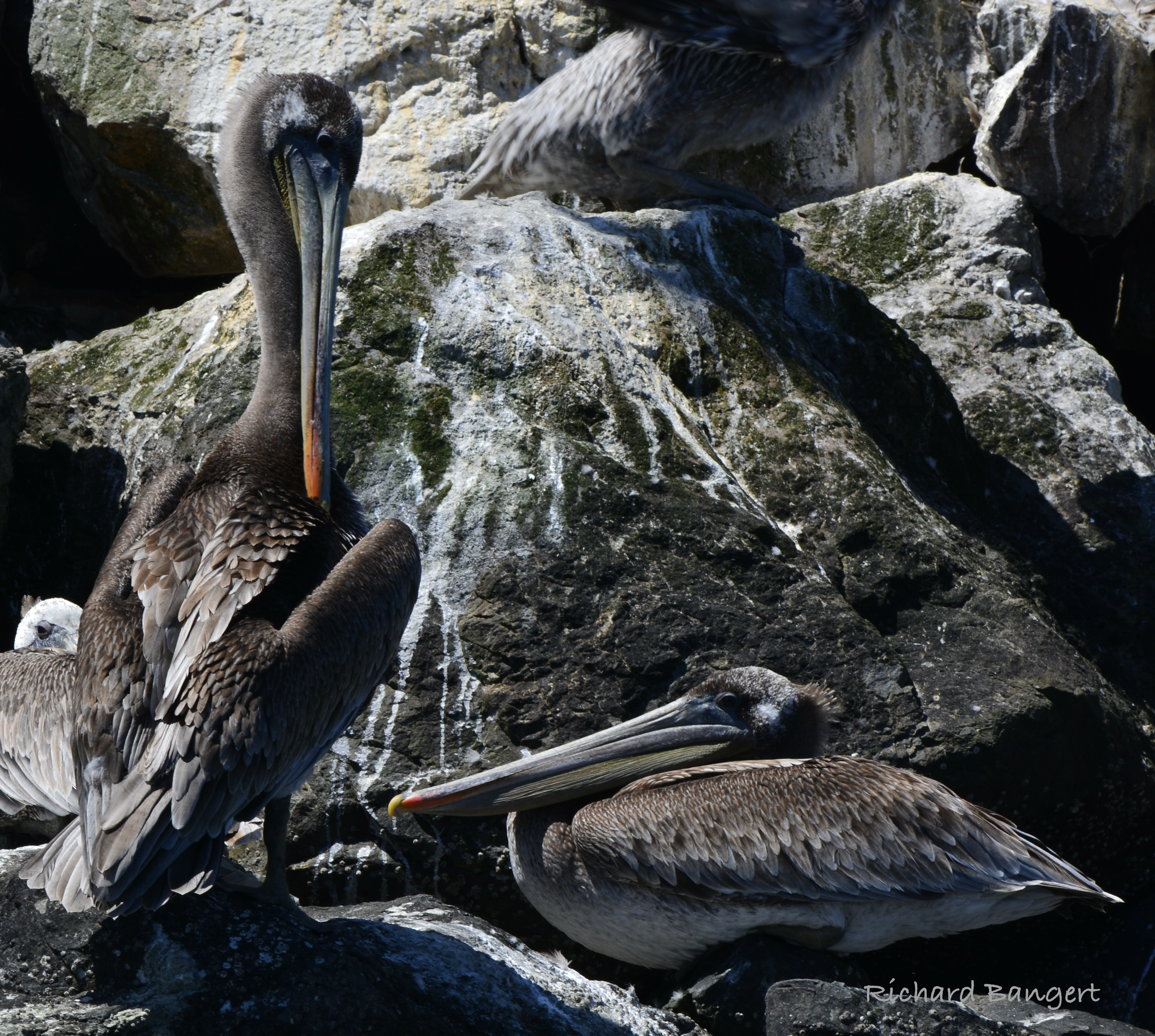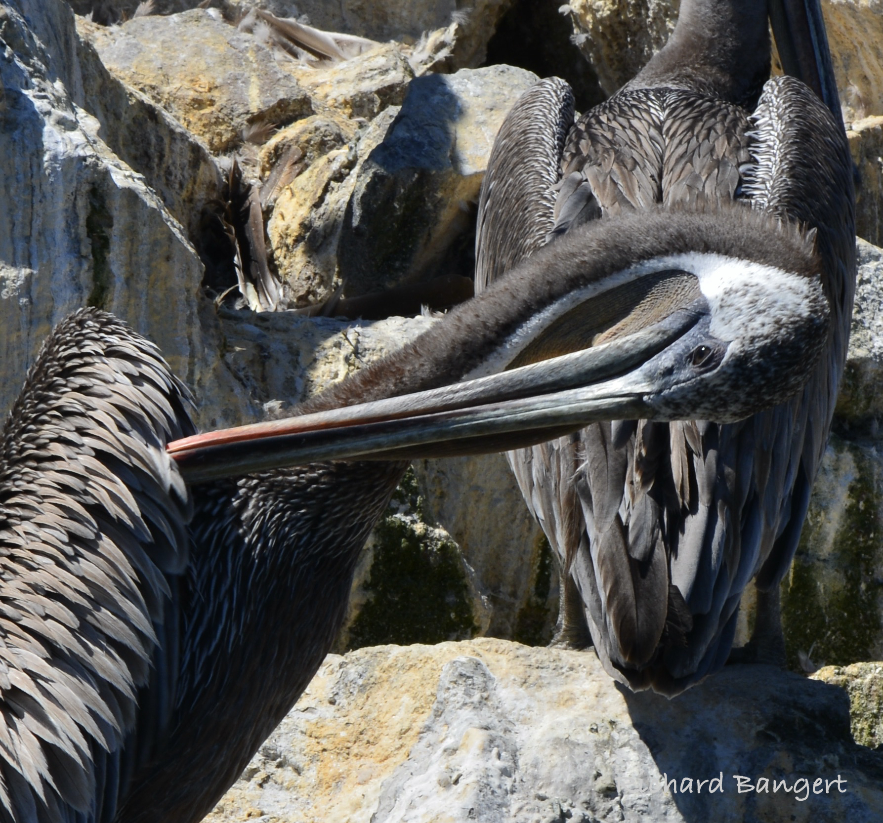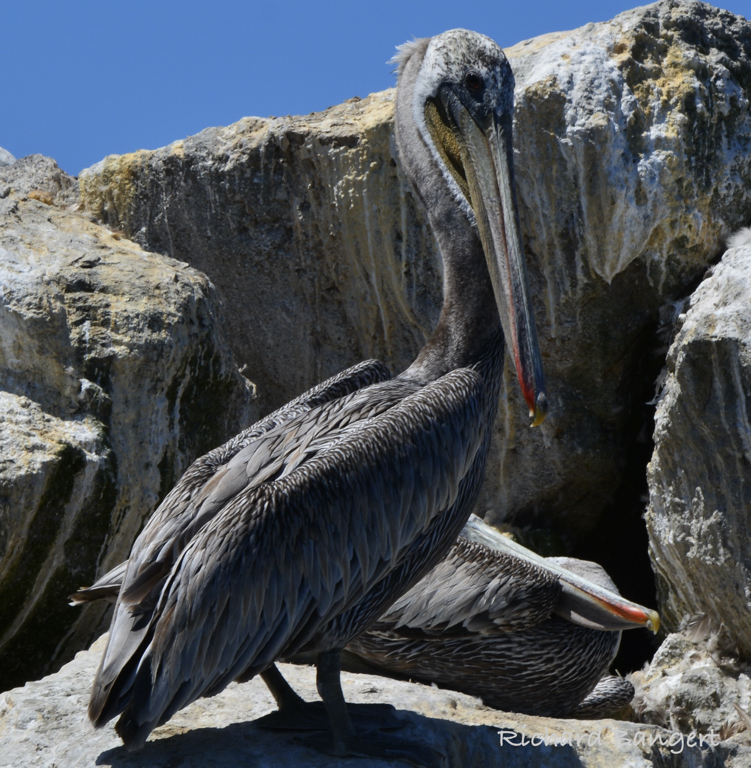 Every summer, thousands of California Brown Pelicans migrate north to the San Francisco Bay area from breeding sites on the Channel Islands and Mexico.  As many as 8,000 have been counted on their favorite resting site in the Bay on the isolated breakwater barrier at Alameda Point, known as Breakwater Island or the outer rock wall.