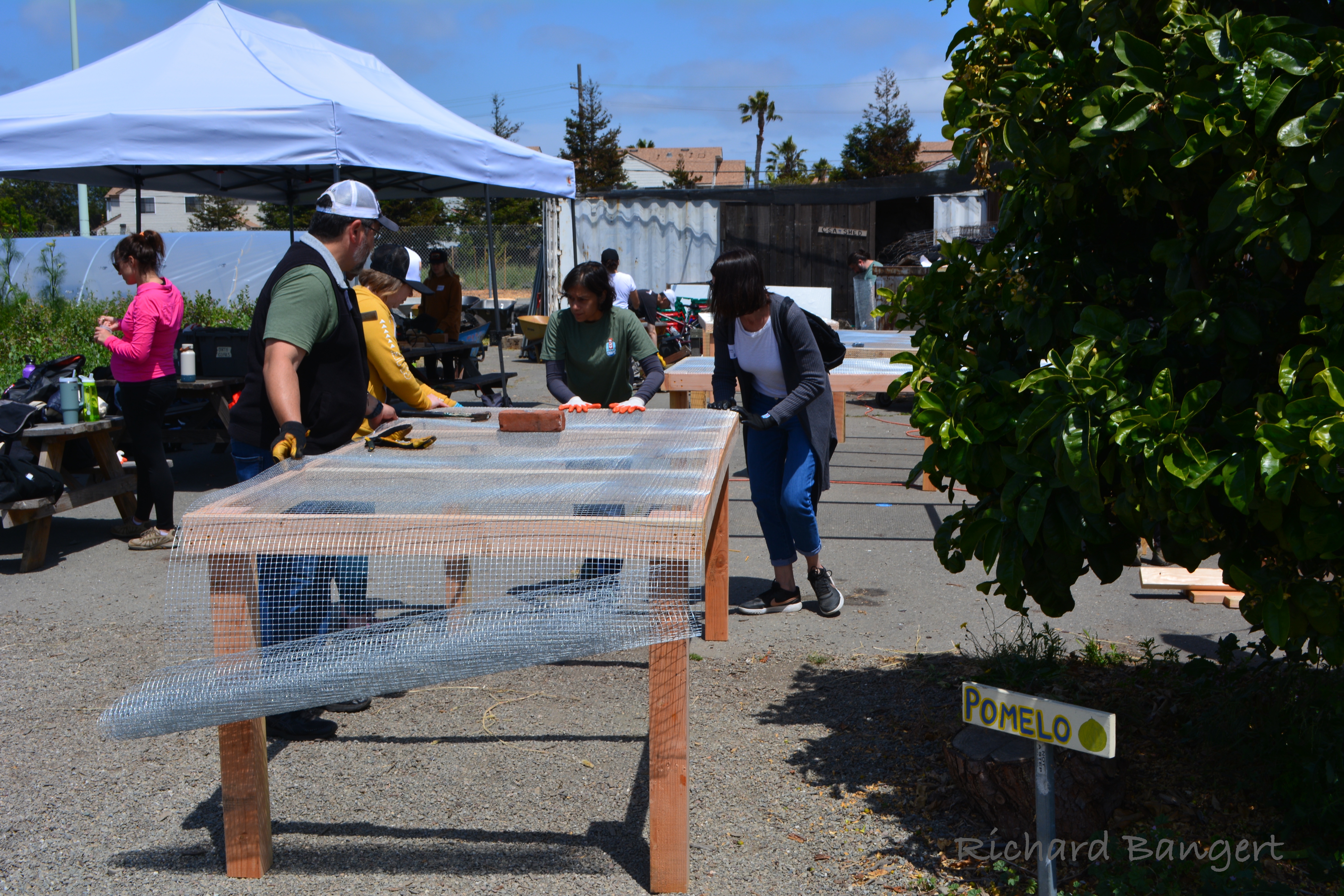Amid the festive atmosphere, the volunteers hoisted extension pole tree pruners to lop off branches from lemon trees, while others piled the trimmings in wheelbarrows to be hustled over to the mountain of green waste. Elsewhere, workers screwed together lumber and tacked down galvanized screening to build veggie rinsing tables, as others nearby assembled and stained picnic tables and benches. Meanwhile, out in the vegetable rows, volunteers worked on hands and knees to pull weeds.