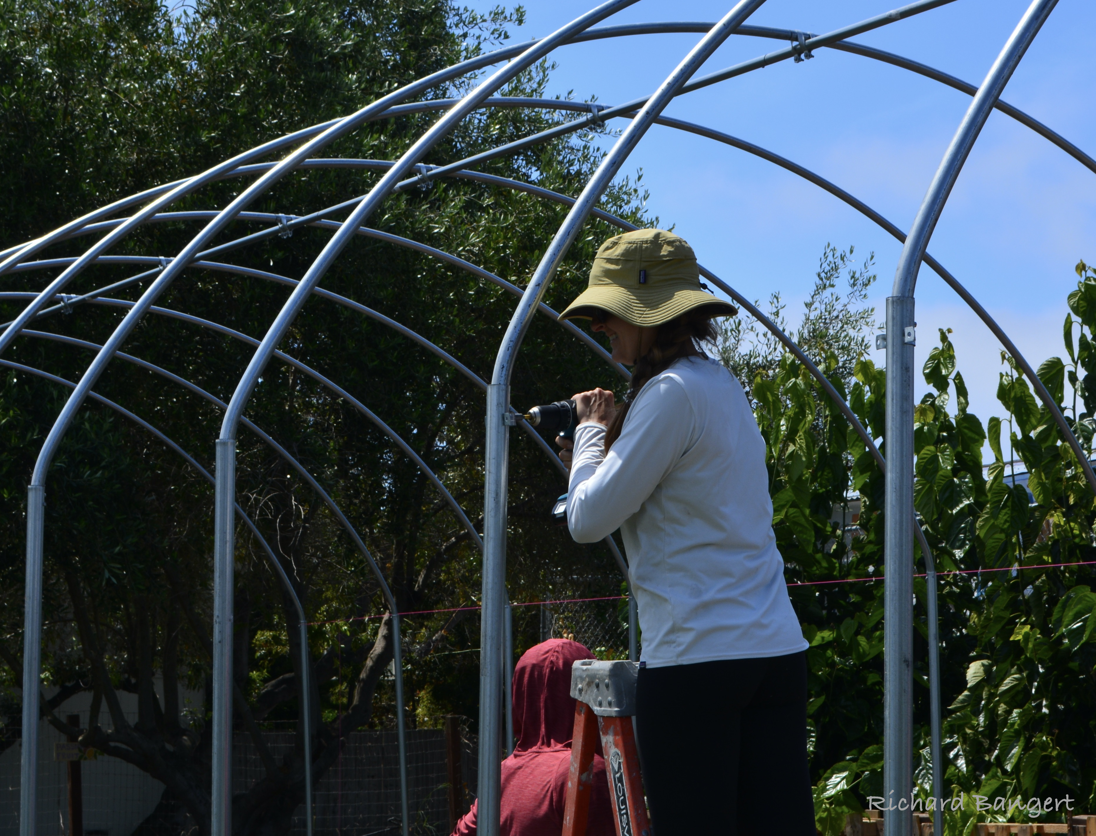 The biggest addition to the farm was a new greenhouse, at least the beginnings of one. The ground was cleared of old plant stubble and the metal frame superstructure was erected by day’s end. The transparent cover and doors, however, will be finished by other volunteers, according to farm manager Johnny Bootlace. Not only will it add capacity when finished, but the size and design of the greenhouse “will produce higher temperatures conducive to growing more vegetable types,” said Bootlace.