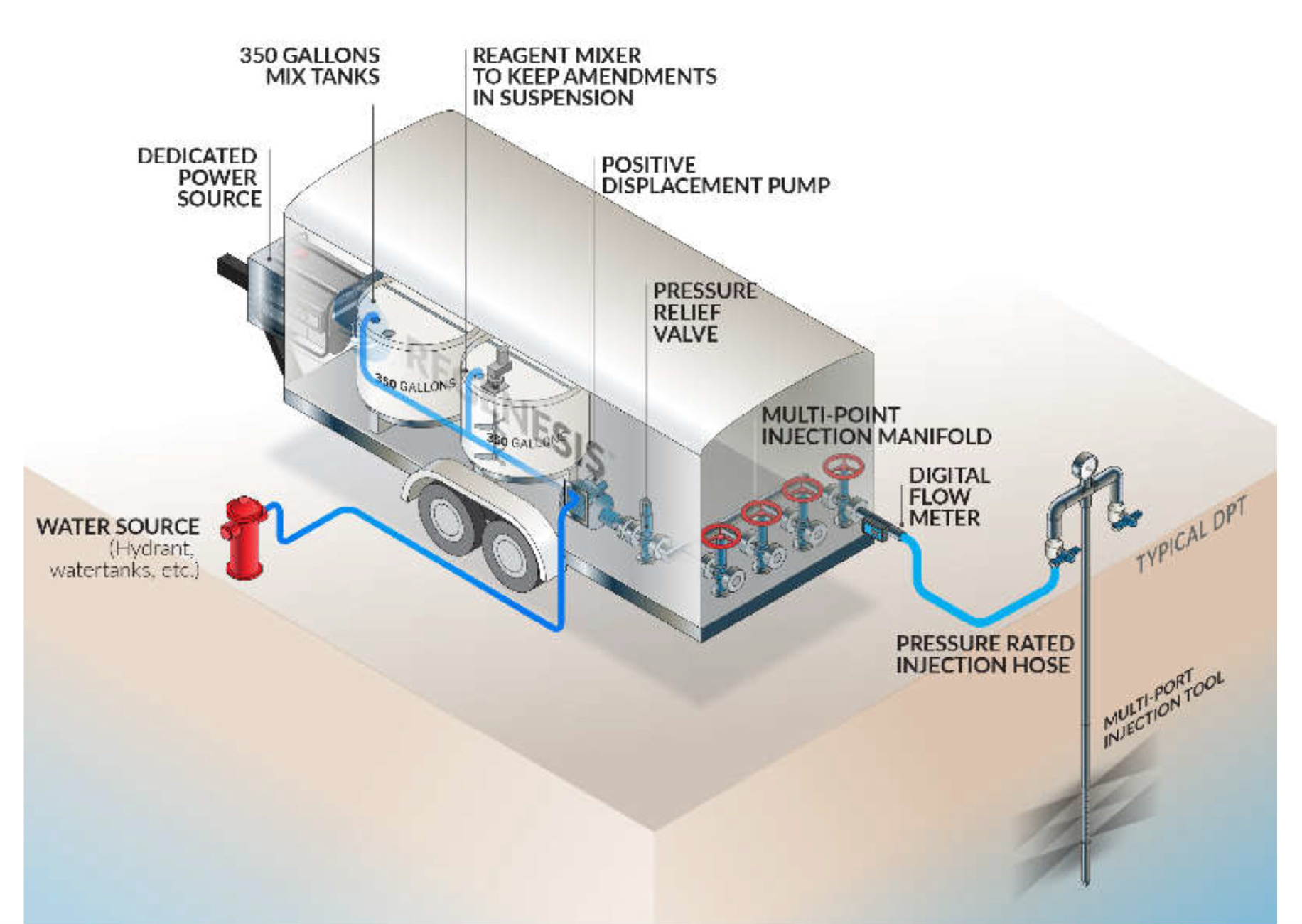 Some 19,000 gallons of the Regenesis product called PlumeStop® has been delivered to the site in 275-gallon tanks. The product is being mixed on-site with hydrant water in a trailer and injected 15 feet deep at 288 different points along a 720-foot strip parallel to the shoreline. As groundwater naturally flows toward the shoreline and passes through the carbon barrier, PFAS molecules become trapped. The product is considered food-grade and harmless to the environment.
