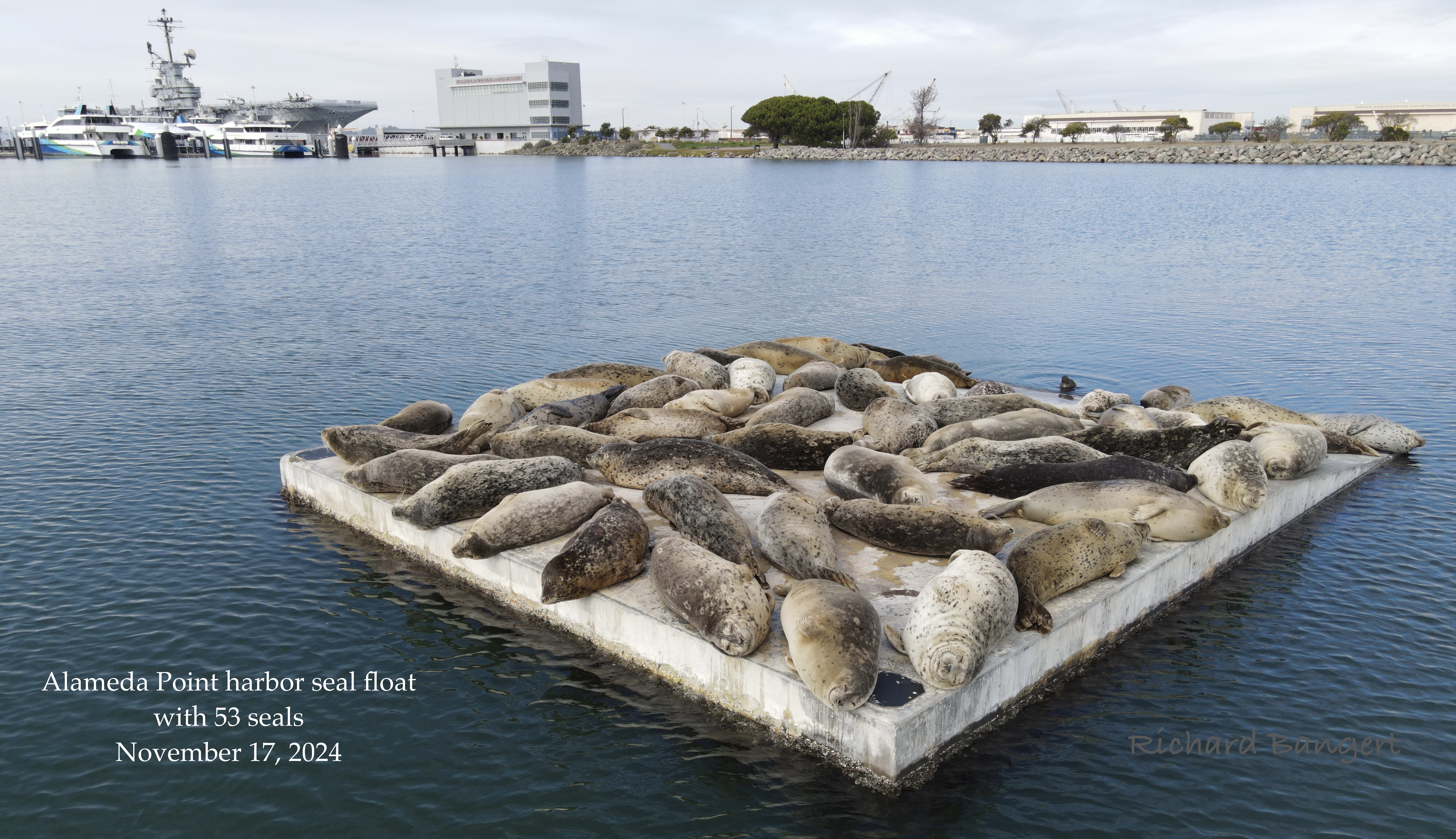 In early December, the numbers of seals on the float typically begins rising dramatically from 40-50 up to more than 80, according to data collected by the volunteer group Alameda Point Harbor Seal Monitors. The combination of cooler temperatures and the herring that come to spawn in the area draws them there.