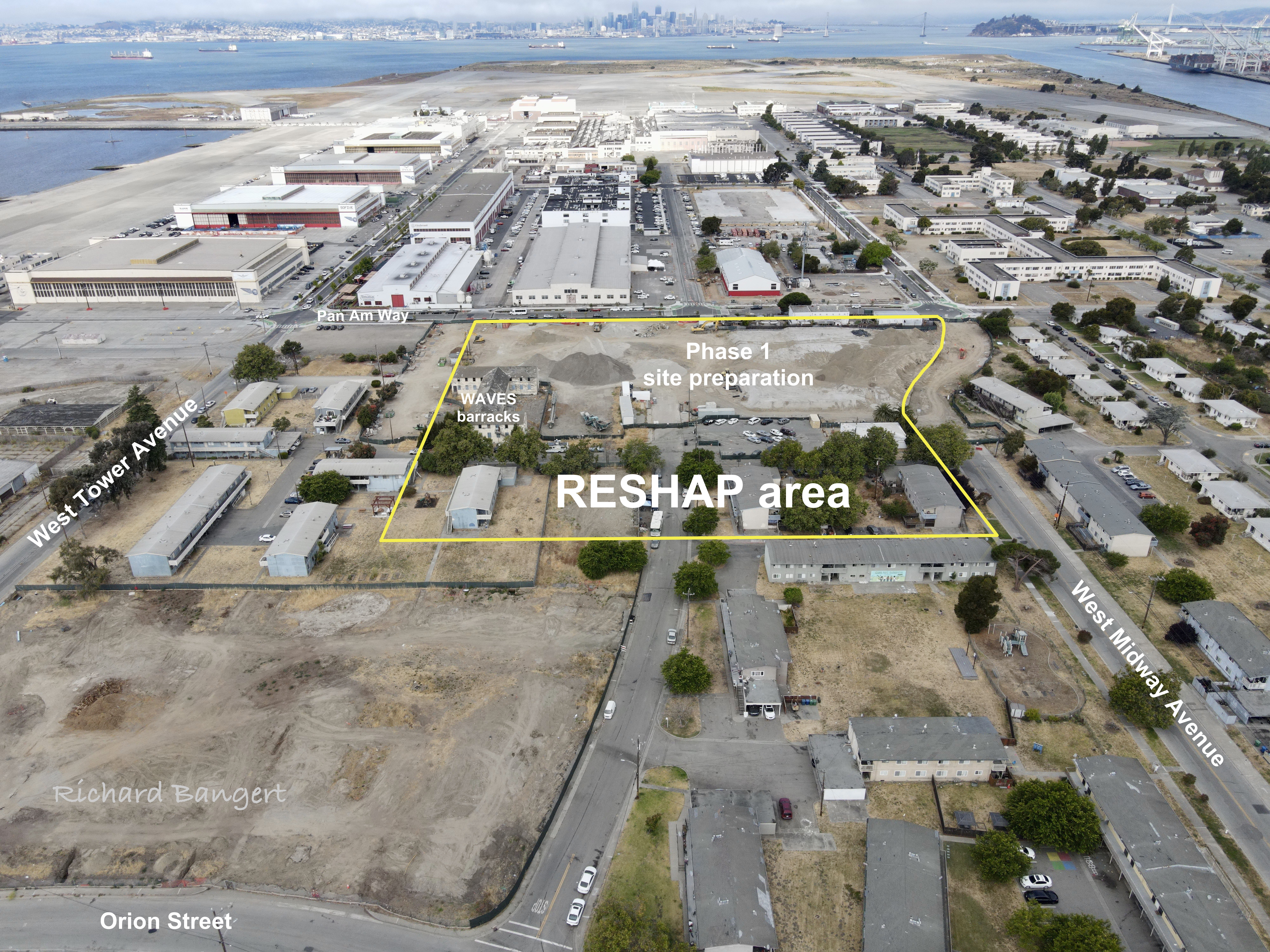 The RESHAP project will be built on eight acres adjacent to the West Midway project. The project will provide 332 units of affordable housing, including replacement units for existing Alameda Point Collaborative residents, along with community spaces and supportive services for formerly homeless individuals, families, veterans, and survivors of domestic violence. It will be constructed by MidPen Housing.