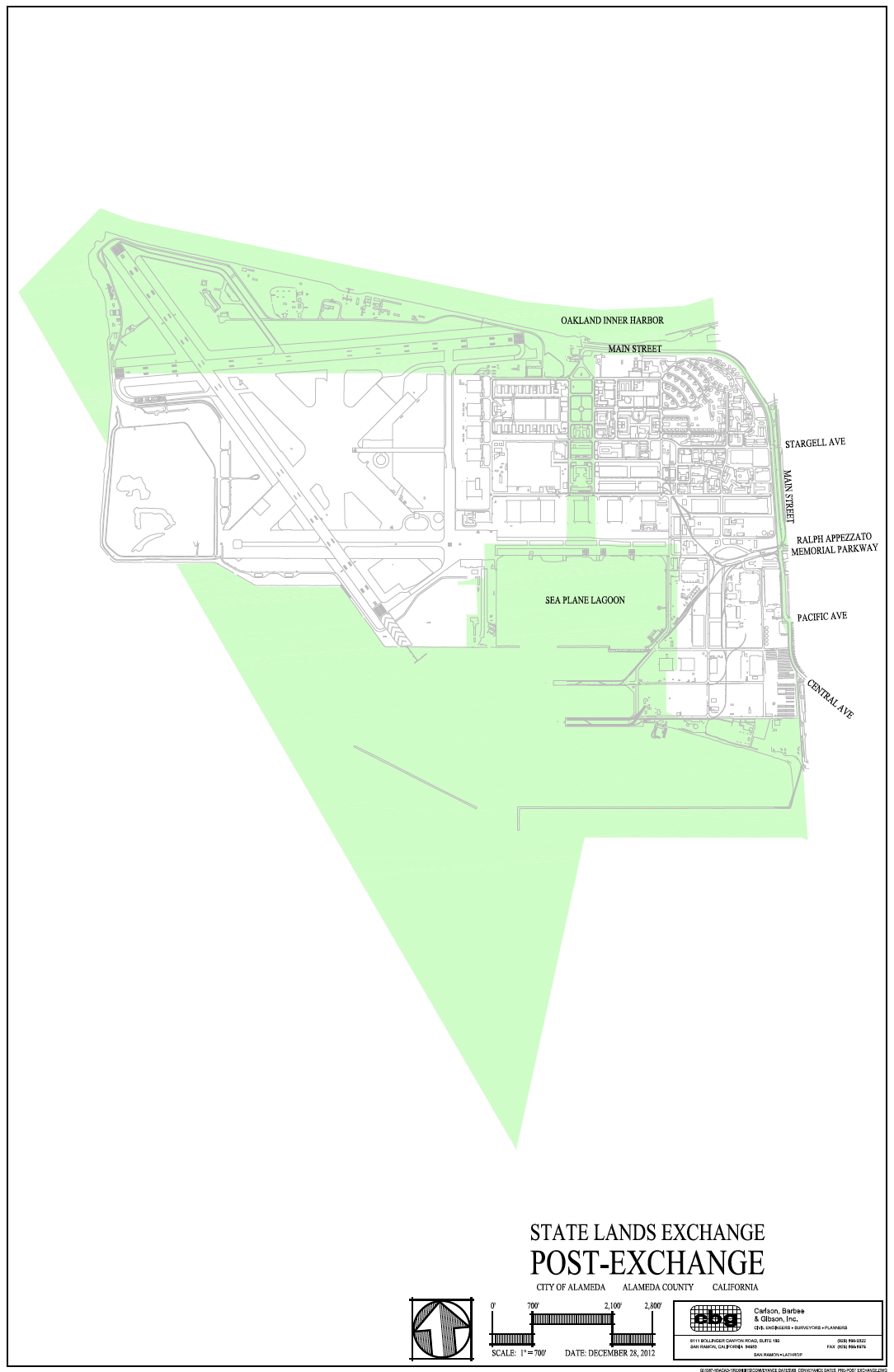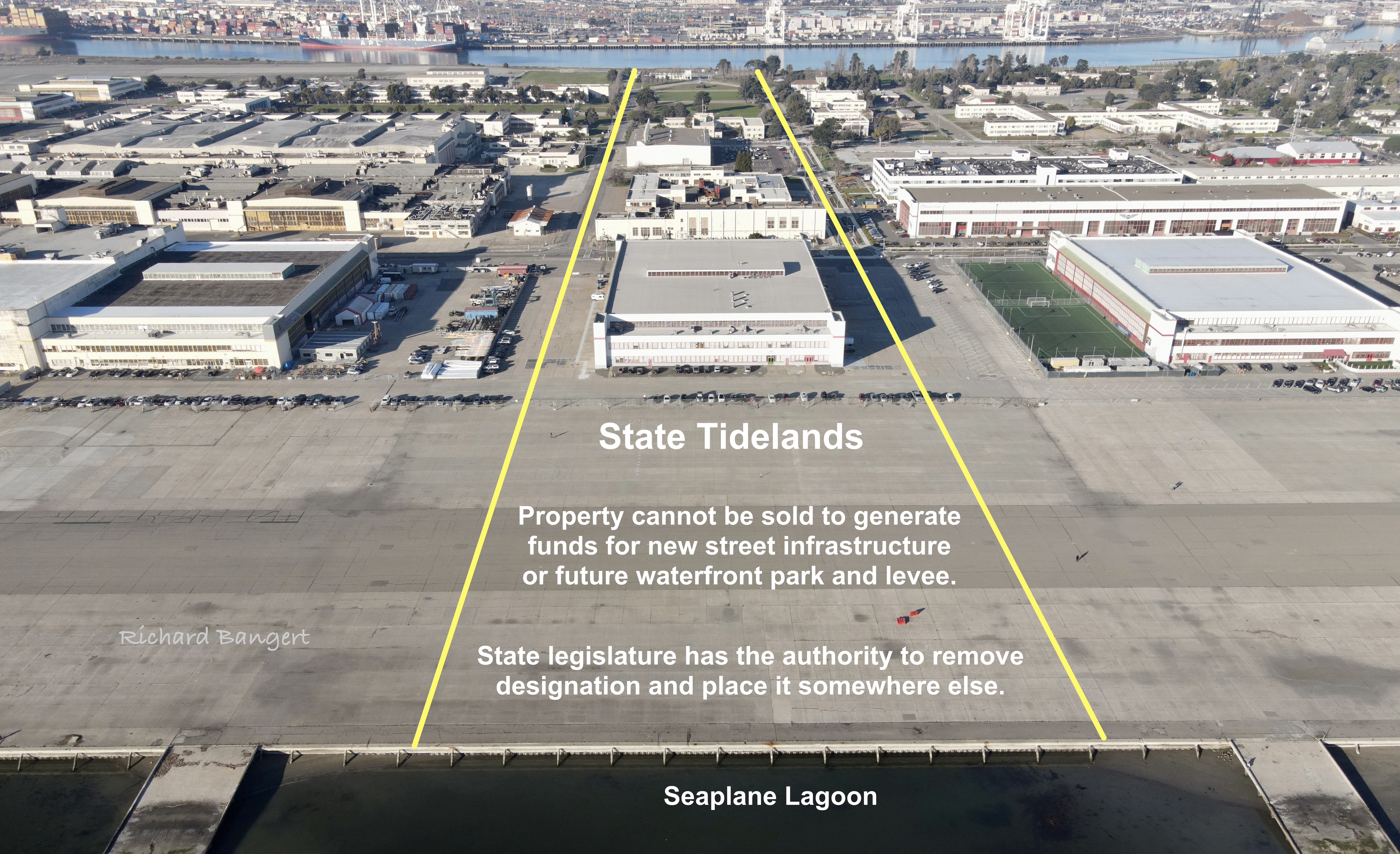 In the early days of base reuse planning, it was determined that much of the future development would be constrained by being state tidelands when it left federal ownership. This prompted the enactment of a state statute that allowed for the swapping of land. Unfortunately, a strip of land dubbed the Tidelands Corridor was left intact as tidelands. The stated rationale in the statute is that it would provide interconnected public access between the Seaplane Lagoon and Oakland Estuary. The Master Infrastructure street grid will now permanently ensure such access without a special zoning overlay.