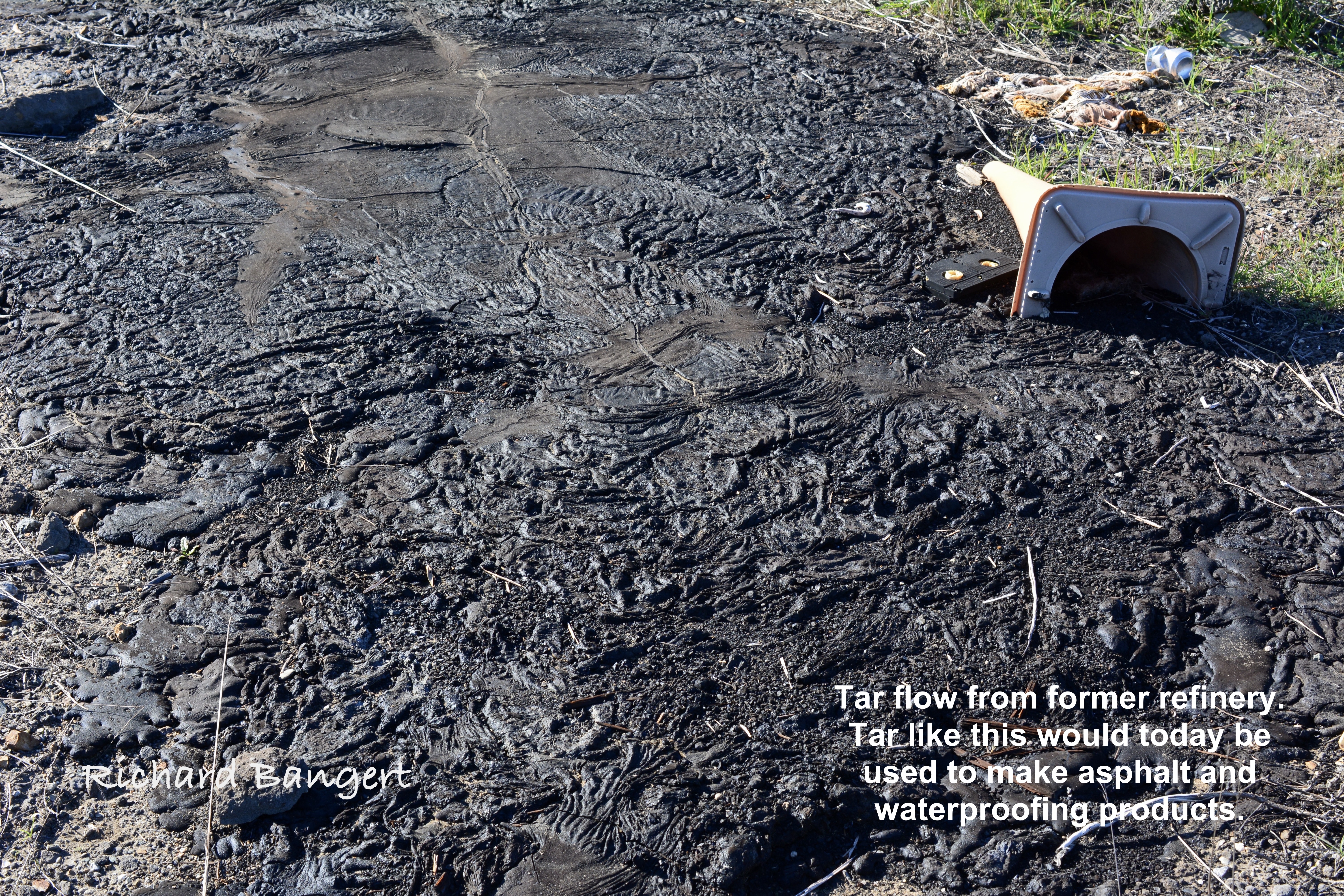 Today’s oil refineries would not discard thick oil as waste after producing kerosene, as was done at Alameda in the late 1800s. After a little more refining to extract products like gasoline, the remaining “bottom of the barrel” thick tar, known as bitumen, would today be sold to producers of asphalt for road construction. The bitumen is mixed with sand, gravel, and stones, acting as the glue to hold it together. Other uses of bitumen include waterproofing products for roofs.