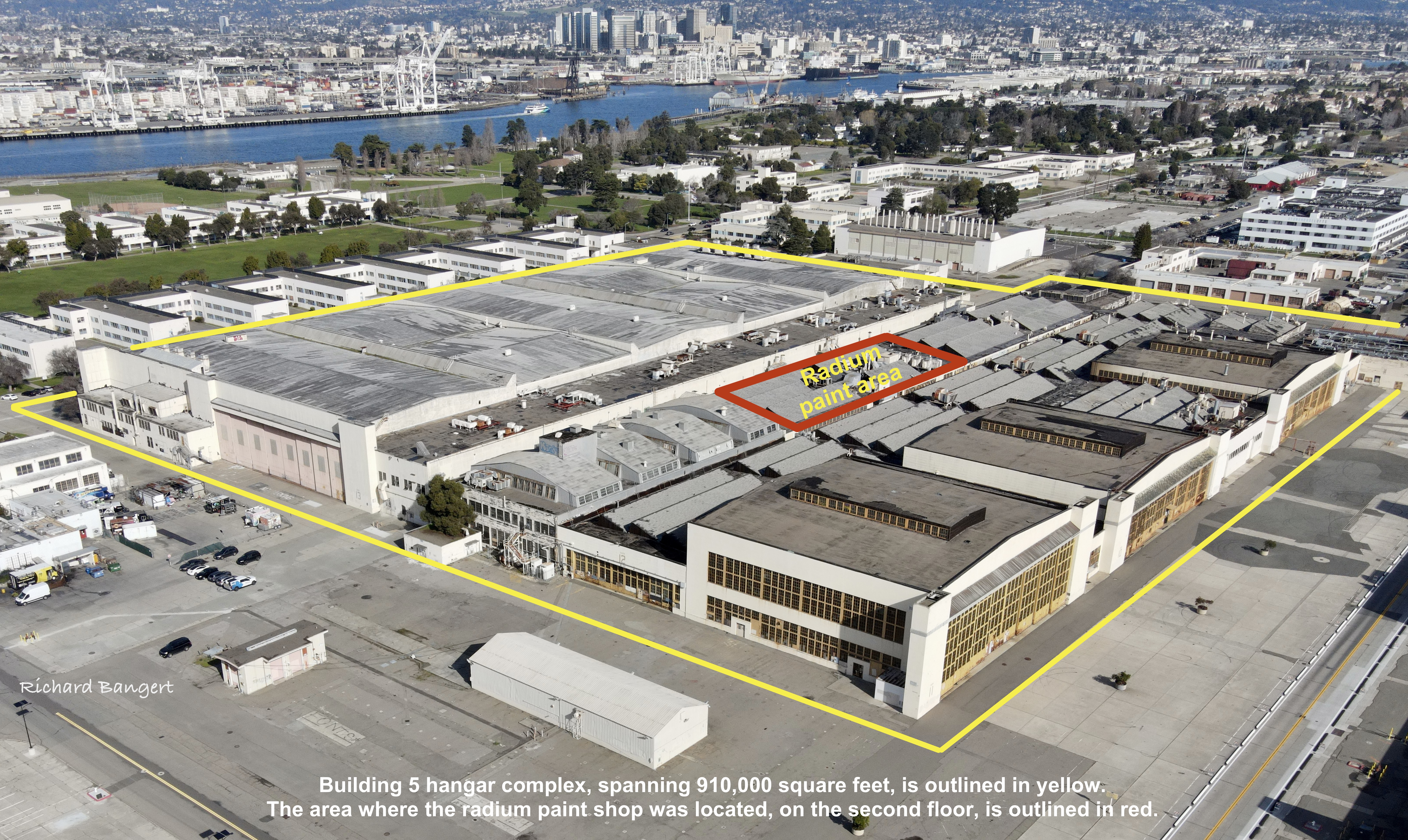 Navy contractors have carried out numerous radium-226 cleanup actions in two buildings at Alameda Point where glow-in-the-dark instrument paint containing radium-226 was handled. Cleanup in Building 400 was deemed completed in November 2018 and made available for unrestricted use. Soon thereafter, however, CDPH decided that the agreed upon cleanup criteria no longer applied to the building across the street, Building 5 (shown below). The agency has yet to provide the Navy with a numerical goal to reach so that the Navy can “provide assurances to future property owners that the radiological remediation is complete,” explained Preston.
