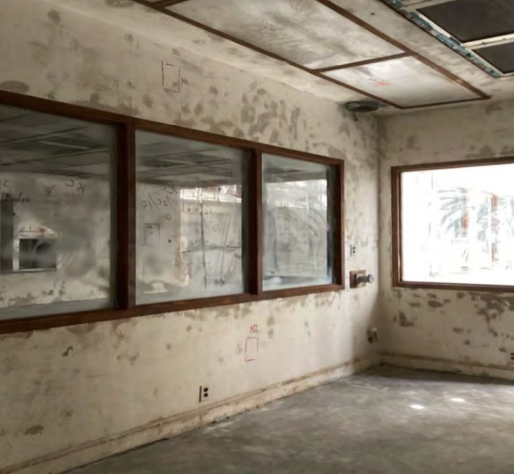 Navy contractors returned on two occasions to remove contaminated surfaces and perform follow-up scanning. An entire non-structural brick wall was removed and numerous wall and floor surfaces were stripped of coatings. Only a handful of areas, such as a second-floor concrete floor with holes where pipes once passed through, were marked for a subsequent and final work plan.