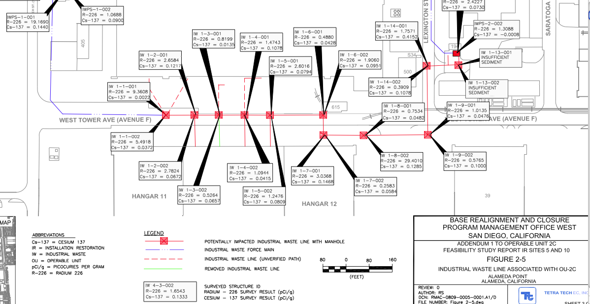 All of the drain lines containing radium-226 paint waste at Alameda Point have either been removed, cleaned, or are scheduled to be cleaned or removed, except for one: The Industrial Waste Line in the hangar area where aircraft dials were painted. This drain line was installed in the mid-1970s after passage of the Clean Water Act prohibited sending industrial waste into public waterways. It sent wastewater to a treatment facility, and is now lying dormant, broken in places, and no longer in use. The big question is what to do about it – leave it alone and create a special radiological license, a special exemption, or dig it up?