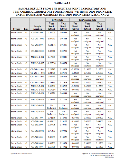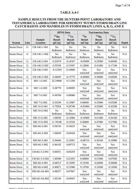 In looking at the readings in the boxes and on the test result tables, there are only a few locations where radium was found to be a problem. “MH” in the box means it is manhole that was tested. “CB” is a catch basin. One reason for the low readings could be because in 2009/10 when the most seriously contaminated lines – F and FF – were being replaced due to radium contamination, the Navy had Storm Drain Line G power flushed to clean it out. The contaminated water was properly disposed of.