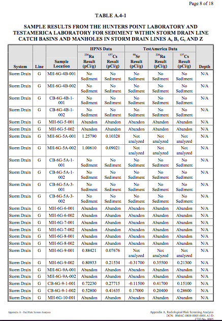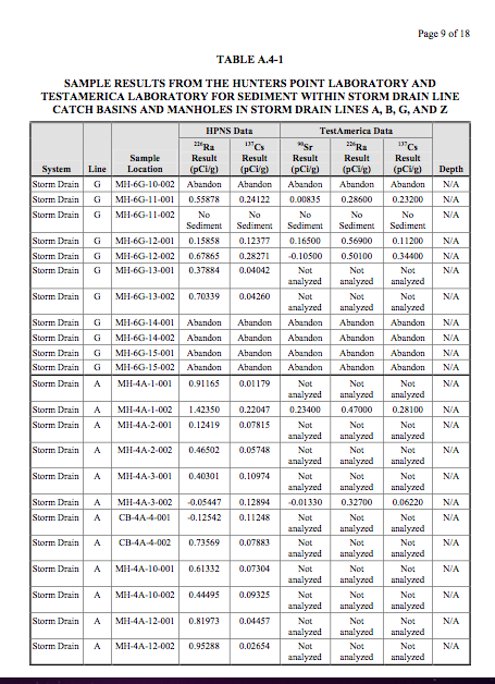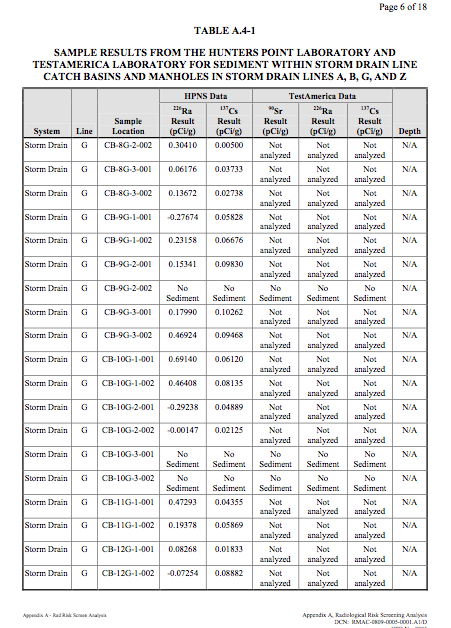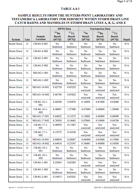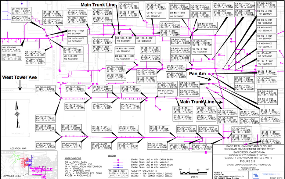 Nuclear Fallout Residue Also Surveyed – The Navy’s contractor also gathered data on the presence of Cesium-137 and Strontium-90. The presence of these two radioactive isotopes in drain lines was expected due to worldwide data showing that nuclear weapons testing and nuclear accidents such as Chernobyl have caused widespread dispersal. There are also records indicating that some observation planes that flew through nuclear fallout during nuclear weapons testing were dismantled and decontaminated at Alameda Point as part of the weapons testing studies.