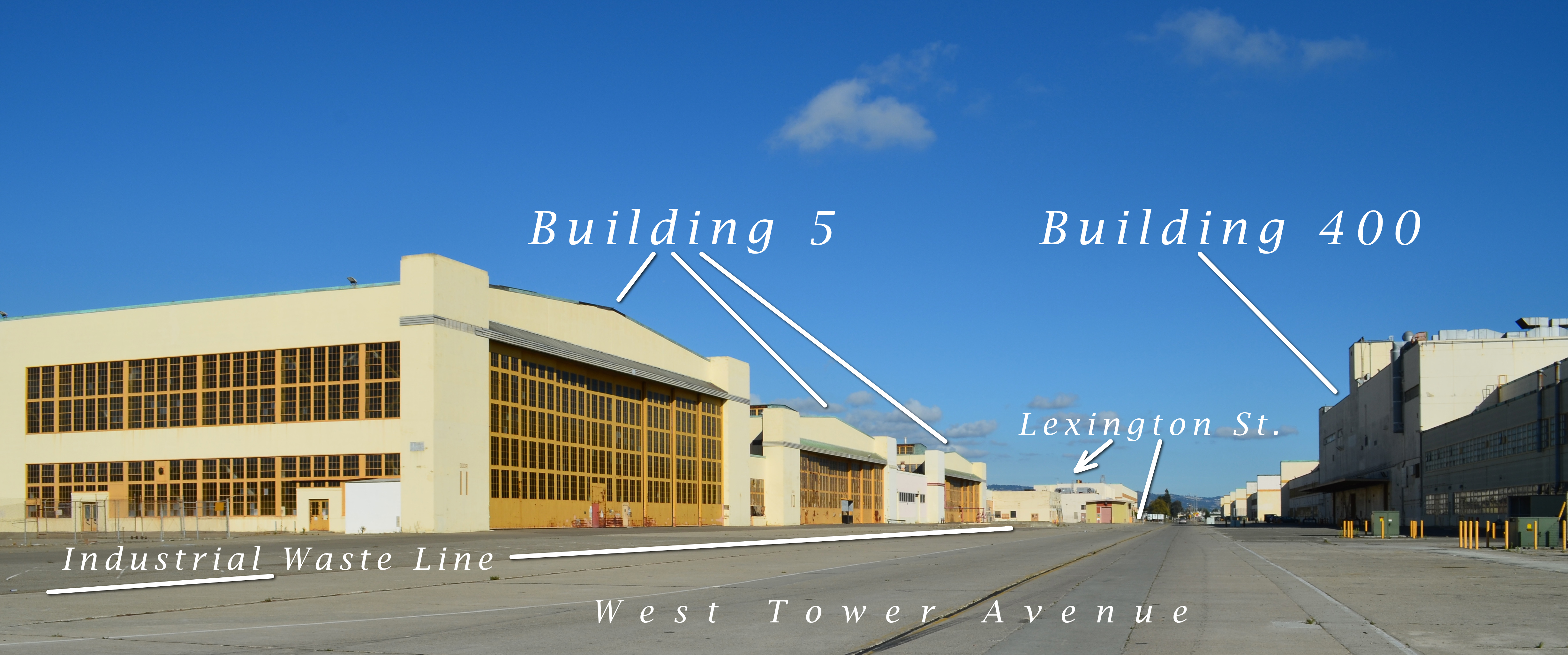 Looking east on West Tower Avenue. Buildings 5 and 400 are where radium-226 paint was applied to aircraft dials and markers. Paint waste contaminated thousands of feet of drain lines, most of which have been removed. The remaining radium-contaminated Industrial Waste Line is partially illustrated showing where it runs in front of Building 5, also known as the Naval Air Rework Facility.